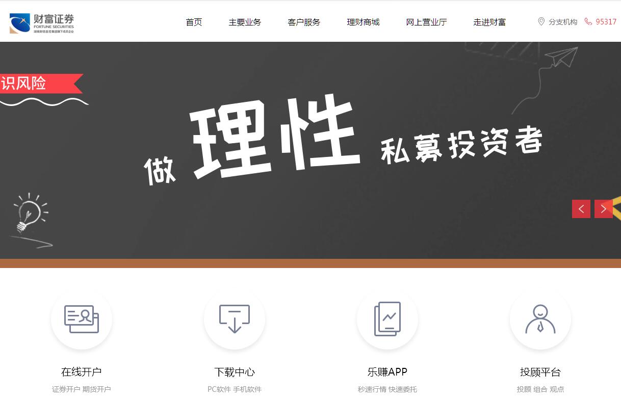 財(cái)富證券有限責(zé)任公司(簡(jiǎn)稱“財(cái)富證券”)是湖南財(cái)信金融控股集團(tuán)有限公司旗下核心企業(yè),湖南省唯一的省屬國(guó)有控股證券公司。公司成立于2002年8月,注冊(cè)資本39.65億元,控股股東為湖南財(cái)信投資控股有限責(zé)任公司,持股比例為96.49%。截至2018年12月31日,公司總資產(chǎn)規(guī)模 203.25億元 ,凈資產(chǎn)規(guī)模 60.01億元 。公司業(yè)務(wù)范圍涵蓋證券經(jīng)紀(jì)、投資銀行、資產(chǎn)管理、投資咨詢、融資融券、固定收益、證券投資、場(chǎng)外市場(chǎng)、期貨經(jīng)紀(jì)、另類投資、基金投資等;全資擁有德盛期貨有限公司、另類投資公司深圳惠和投資有限公司、私募基金公司深圳市惠和基金管理有限公司;全國(guó)設(shè)有4家分公司,75家營(yíng)業(yè)部;現(xiàn)有員工1800余人。公司依托控股股東牌照齊全、實(shí)力雄厚的金融控股平臺(tái),在債券承銷、互聯(lián)網(wǎng)金融、固定收益投資等領(lǐng)域形成并保持了行業(yè)競(jìng)爭(zhēng)優(yōu)勢(shì),可以全方位滿足企業(yè)與個(gè)人投資者多元化金融服務(wù)需求。公司在國(guó)家發(fā)改委2017年度企業(yè)債券主承銷商信用評(píng)價(jià)中,排名全行業(yè)第3位,榮獲中央結(jié)算公司“2017年中債優(yōu)秀承銷機(jī)構(gòu)獎(jiǎng)”,近年來(lái),公司還榮獲長(zhǎng)沙市規(guī)模效益獎(jiǎng),湖南省文明標(biāo)兵單位、湖南省科學(xué)技術(shù)二等獎(jiǎng)、湖南金融創(chuàng)新力量獎(jiǎng),中國(guó)證券業(yè)協(xié)會(huì)優(yōu)秀課題報(bào)告,中國(guó)證券期貨業(yè)優(yōu)秀融資扶貧獎(jiǎng)、優(yōu)秀定點(diǎn)扶貧獎(jiǎng)、最佳產(chǎn)業(yè)扶貧項(xiàng)目獎(jiǎng),以及證券時(shí)報(bào)“中國(guó)區(qū)最佳債券投行”、“中國(guó)區(qū)最佳企業(yè)債承銷團(tuán)隊(duì)”、“中國(guó)最具突破證券經(jīng)紀(jì)商”、“十佳銀行間債券投行”、“五星扶貧債券承銷商”等多個(gè)獎(jiǎng)項(xiàng)。