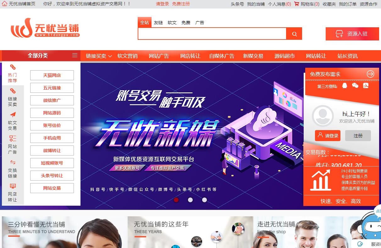 廈門(mén)網(wǎng)盾科技有限公司成立于2006年,注冊(cè)資本100萬(wàn),立足無(wú)形資產(chǎn)交易,布局企業(yè)生態(tài)全周期服務(wù)的一站式網(wǎng)站。自2006年成立發(fā)展至今,無(wú)憂(yōu)當(dāng)鋪已形成了以網(wǎng)店交易、源碼超市交易、友情鏈接、新媒交易等4大業(yè)務(wù)為主的一站式閉環(huán)服務(wù)體系。無(wú)憂(yōu)新媒專(zhuān)注于打造覆蓋企業(yè)生態(tài)全周期的一站式服務(wù),充分把握企業(yè)發(fā)展中各個(gè)環(huán)節(jié)的需求:當(dāng)您打算創(chuàng)業(yè),無(wú)憂(yōu)當(dāng)鋪很多項(xiàng)目可以讓您輕松起家;如果您需要推廣,無(wú)憂(yōu)當(dāng)鋪為您提供海量的自媒體賬號(hào)服務(wù)、全覆蓋的媒體推廣渠道;當(dāng)您的公司架構(gòu)不足以支撐業(yè)務(wù)體系時(shí),無(wú)憂(yōu)當(dāng)鋪有企業(yè)變更等服務(wù)供您選擇;當(dāng)您的企業(yè)面臨互聯(lián)網(wǎng)轉(zhuǎn)型,無(wú)憂(yōu)當(dāng)鋪提供網(wǎng)站APP定制、網(wǎng)店轉(zhuǎn)讓、天貓商城代入駐等服務(wù),助您全情擁抱互聯(lián)網(wǎng)+。無(wú)憂(yōu)當(dāng)鋪,用服務(wù),致敬你的商業(yè)夢(mèng)想, 用服務(wù),打造你的商業(yè)帝國(guó)。