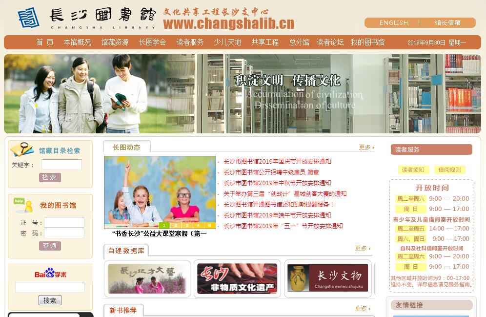 長沙市圖書館是地市級的綜合性公共圖書館,成立于1960年,老館館址定王臺是湖南圖書館事業(yè)的發(fā)祥地。新館座落于新河三角洲長沙濱江文化園內(nèi),于2015年底全面開放,總建筑面積3.2萬平方米,共5層,規(guī)劃藏書量200萬冊,每天可接待讀者10000余人次。圖書館外形設(shè)計獨具創(chuàng)意,如同巨大的頑石屹立于湘江和瀏陽河的匯合處,象征著開放、創(chuàng)新的“湖湘精神”和剛強、勇敢的“湖南性格”。圖書館外墻設(shè)計方案,取材于《荀子·勸學(xué)篇》,展現(xiàn)了圖書館的文化底蘊。館內(nèi)主要設(shè)置有社科文獻(xiàn)借閱室、自科文獻(xiàn)借閱室、報刊借閱室、兒童借閱室、青少年借閱室、視障文獻(xiàn)借閱室、電子文獻(xiàn)閱覽室、多元文化館、長沙人文館、多功能報告廳、新三角創(chuàng)客空間、24小時自助圖書館、咖啡書吧、樂之書店、閱讀花園等二十多個功能區(qū)域。全館現(xiàn)有職工106人,實行免費開放。目前已在全市建立分館100家,24小時自助圖書館7個,配備了流動圖書車,設(shè)置流動服務(wù)點86個,實現(xiàn)了總分館之間一卡“通借通還”借閱服務(wù)。長沙圖書館以打造城市“文化綜合體”為目標(biāo),常年舉辦講座、培訓(xùn)、展覽、閱讀推廣等文化活動。致力建設(shè)成為長沙文獻(xiàn)信息資源服務(wù)中心、全民閱讀終身教育中心、區(qū)域圖書館網(wǎng)絡(luò)中心、文化學(xué)術(shù)交流中心。