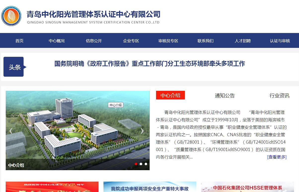 “青島中化陽光管理體系認證中心有限公司”成立于1999年10月,坐落于美麗的海濱城市-青島,是國內經(jīng)政府授權最早從事“職業(yè)健康安全管理體系”認證的兩家認證機構之一。按照國家CNCA、CNAS批準的“職業(yè)健康安全管理體系”(GB/T28001)、“環(huán)境管理體系”(GB/T24001idtISO14001)、“質量管理體系(GB/T19001idtISO9001) 的認證資質在國內各行業(yè)開展相關的認證工作,是中國石化12家質量管理體系準入認證機構之一。同時從事中國石化集團公司下屬企業(yè)及相關方的HSSE管理體系專項審核工作。中心以中國石油化工股份有限公司安全工程研究院為技術支撐,遵循"依法合規(guī)、獨立公正、專業(yè)引領、管控風險、優(yōu)質高效、追求卓越“的質量方針;恪守不以盈利為目的的有償服務原則;堅持獨立公正、誠實守信的服務理念;以嚴謹?shù)目茖W態(tài)度、嚴格的管理,為企業(yè)提供優(yōu)質、高效、周到的認證服務工作,與企業(yè)共同追求卓越績效,實現(xiàn)可持續(xù)發(fā)展。