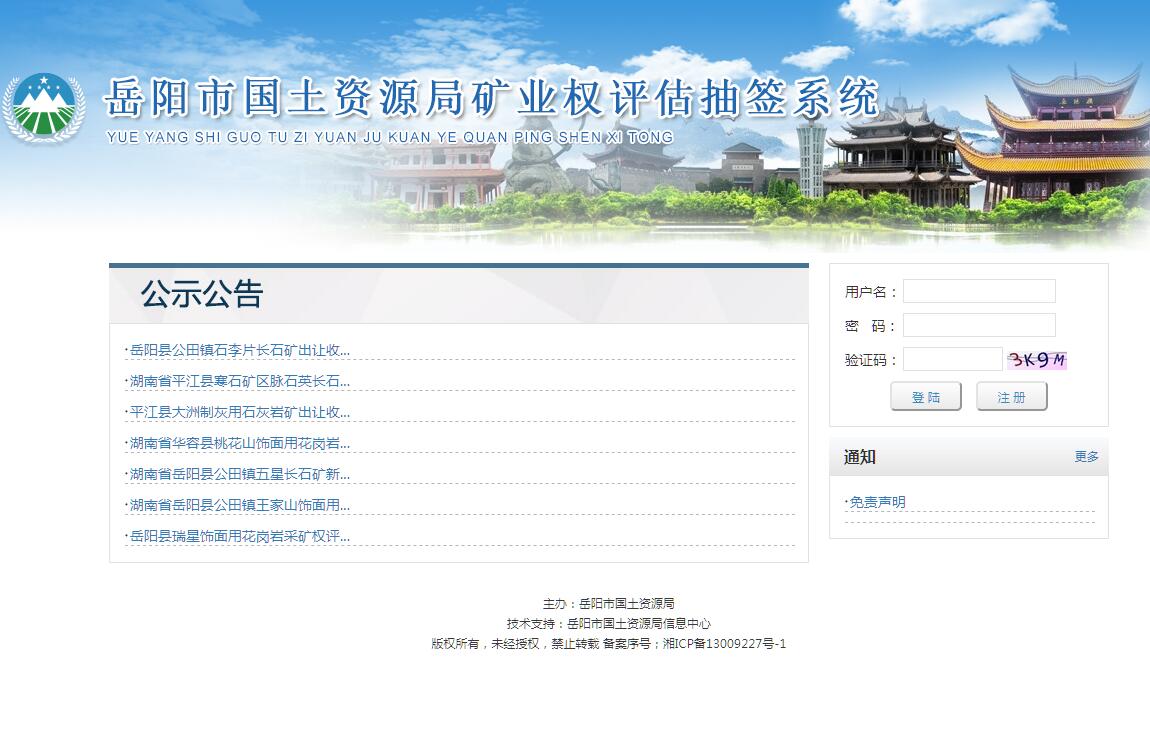 | 網(wǎng)站名稱: | 岳陽市國(guó)土資源局礦業(yè)評(píng)審權(quán)抽簽系統(tǒng) | ||