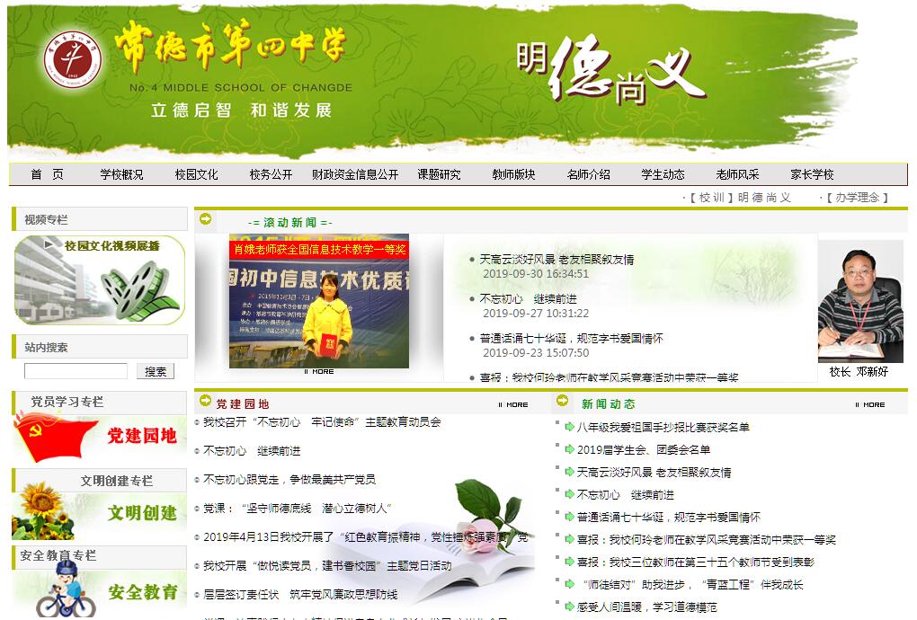 常德市第四中學(xué)位始建于 1942年,歷經(jīng)70余年風(fēng)雨滄桑,積淀了豐厚的文化底蘊,擁有優(yōu)雅的育人環(huán)境、先進(jìn)的教學(xué)設(shè)備、雄厚的師資力量,是一顆鑲嵌在沅水之濱的璀璨明珠。學(xué)校原名湖南省私立明義中學(xué),于1942年8月由丁瑚等四人發(fā)起創(chuàng)辦。次年5月經(jīng)湖南省教育廳批準(zhǔn)立案,同年11月日軍侵常時,校舍被焚,乃遷往常德縣太陽山白鹿寺復(fù)課。抗戰(zhàn)勝利后,于1946年8月借用常德縣公產(chǎn)府城隍廟為校址(即現(xiàn)址)。學(xué)校現(xiàn)有24個教學(xué)班,在籍學(xué)生1100多人,教職工110人。自建校以來,秉承“明德尚義”精神,以德立校,把培養(yǎng)明義之人作為學(xué)校立校之本,積淀了豐厚的學(xué)校文化底蘊。學(xué)校確定了新時期辦學(xué)理念,即“立德啟智,和諧發(fā)展”,新時期培養(yǎng)目標(biāo)“學(xué)業(yè)有進(jìn)步,品行無差生”。近幾年來,學(xué)校更是立足長遠(yuǎn),走內(nèi)涵發(fā)展之路,在弘揚明義文化、創(chuàng)精品名校方面取得了長足進(jìn)展。學(xué)校領(lǐng)導(dǎo)班子堅強(qiáng)有力,務(wù)真求實,凝聚力強(qiáng),在推進(jìn)素質(zhì)教育與精細(xì)管理方面具有前瞻性的目光。學(xué)校師資力量雄厚,學(xué)校教師隊伍整體素質(zhì)居市直中學(xué)前列,目前學(xué)校共有110名教職工,學(xué)歷達(dá)標(biāo)率100%,其中高級教師32人,國家、省、市級骨干教師17名,市級學(xué)科帶頭人7名。全國優(yōu)秀教師、優(yōu)秀班主任1名,湖南省初中“未來教育家”培養(yǎng)對象1名,湖南省優(yōu)秀教師1名,市級以上優(yōu)秀教師15名。近幾年,學(xué)校始終樹立和落實科學(xué)的教育發(fā)展觀,深化改革,搶抓機(jī)遇,不斷創(chuàng)新,教育教學(xué)工作連創(chuàng)佳績。學(xué)校連續(xù)3年被國家教育部關(guān)心下一代工作委員會評為“關(guān)心下一代工作示范學(xué)?!?;連續(xù)7年被湖南省教育學(xué)會學(xué)校心理教育專業(yè)委員會評為省級學(xué)校心理健康教育“先進(jìn)單位”;連續(xù)3年常德市教育科研工作先進(jìn)學(xué)校;連續(xù)十年被常德市教育局評為“中考優(yōu)秀學(xué)?!?;連續(xù)3年學(xué)校綜合素質(zhì)評價在市直公辦初級中學(xué)獲得第一名;學(xué)校已連續(xù)5年被評為目標(biāo)管理先進(jìn)單位。2017年被市文明委評為“文明校園”,被市教育局評為“最美校園?!苯鼛啄?,學(xué)校還先后贏得省級文明衛(wèi)生單位、省級園林式單位、廉潔文化示范校、市級示范家長學(xué)校、第一批全國學(xué)校體育工作示范學(xué)校、常德市安全文明校園、常德市語言文字規(guī)范化示范校、湖南省首批經(jīng)典誦讀特色學(xué)校、湖南省現(xiàn)代技術(shù)教育實驗學(xué)校、湖南省中小學(xué)校長掛職鍛煉基地、全國中小學(xué)校優(yōu)秀網(wǎng)站、市級文明單位等殊榮。