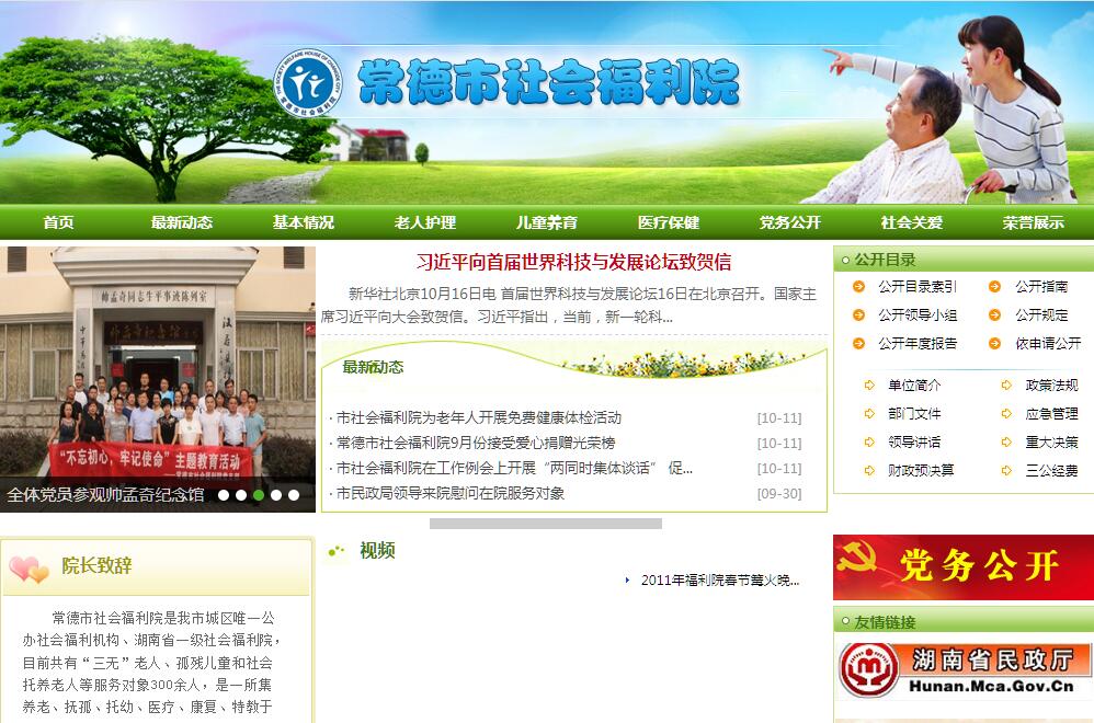常德市社會福利院始建于1950年,是一所集收養(yǎng)、托養(yǎng)、撫孤、醫(yī)療、康復(fù)、服務(wù)于一體的綜合性省一級社會福利院,主要從事市城區(qū)“三無”孤寡老人和全市孤殘兒童的收養(yǎng)與安置,同時開展社會托老、醫(yī)療以及殘疾兒童康復(fù)服務(wù)。這里交通便利,坐落在常德市人民西路3588號,西臨建設(shè)中的三橋,東臨新河渠,有1、3、7、42路公交車??空?。院班子成員6人,其中院長、書記各1名,副院長3名,紀(jì)檢員1名。內(nèi)設(shè)部門有辦公室、監(jiān)察室、財務(wù)部、兒童福利指導(dǎo)中心、兒童服務(wù)部、老人服務(wù)部、殘疾人托管部、后勤服務(wù)部和醫(yī)療服務(wù)部9個部室。目前擁有床位500張,占地面積4.5萬平方米,約71畝。綠化面積2.3萬平方米,建筑面積2.4萬平方米。院落布局合理,各項服務(wù)功能及配套設(shè)施齊全,綠樹成蔭,花草鮮美,環(huán)境怡人,院內(nèi)綠樹成蔭,花草鮮美,環(huán)境怡人,綠化面積達(dá)到2.3萬平方米,總建筑面積達(dá)2.06萬平方米,有三個健身休閑廣場和包括門球廠在內(nèi)的各類球廠,是老人、兒童生活的樂園。老人房間設(shè)有衛(wèi)生間、冷熱水、緊急呼叫系統(tǒng),數(shù)字電視和電話,惠民醫(yī)院科室齊全,能滿足各類醫(yī)療康復(fù)需求,醫(yī)務(wù)人員定期開展體檢、巡診和保健康復(fù)指導(dǎo)。開辦有 “相信自己”特教學(xué)校,長期對學(xué)齡前殘疾兒童進(jìn)行啟蒙教育。建院以來,我院共收養(yǎng)“三無老人”1500多人,社會遺棄孤殘兒童1400多人。為了孤殘兒童早日回歸家庭,融入社會。我院先后與美國、加拿大、西班牙、挪威、比利時、冰島、丹麥、荷蘭、瑞典、瑞士等多個國家建立了棄嬰兒童領(lǐng)養(yǎng)關(guān)系,有1188名兒童被領(lǐng)養(yǎng),找到了真正屬于自己的家。每年都有國外家庭帶孩子來院尋根回訪。我院無論是對孤殘兒童的養(yǎng)育,還是對老年人的護(hù)理,都始終秉承家庭化、人性化、親情化、規(guī)范化的服務(wù)理念和“愛心永存關(guān)愛老幼服務(wù)社會真誠奉獻(xiàn)”的服務(wù)宗旨,堅持以人為本,不斷解放思想、開拓創(chuàng)新,積極探索新形勢下實現(xiàn)福利事業(yè)科學(xué)發(fā)展的新路子,各項工作取得可喜成績。2005年成功通過了ISO9001:2000國際質(zhì)量管理體系的認(rèn)證,成為了湖南省第二家獲得該體系認(rèn)證的福利院。近幾年,我院先后獲得“全國敬老文明號”、“全國最佳養(yǎng)老機構(gòu)”“省級文明單位”“省級園林式單位”、“檔案規(guī)范化管理省特級單位”、“省級巾幗文明崗”、“全省福利院(福利中心)管理服務(wù)先進(jìn)單位”、、“湖南省孝親敬老模范單位”、湖南省民政系統(tǒng)先進(jìn)集體”、“湖南省示范性福利機構(gòu)”、“涉外送養(yǎng)工作先進(jìn)福利機構(gòu)”、“市檔案工作先進(jìn)單位”、“市級模范職工之家”、“市直機關(guān)先進(jìn)基層黨組織”、“市人民滿意先進(jìn)單位”等榮譽稱號。