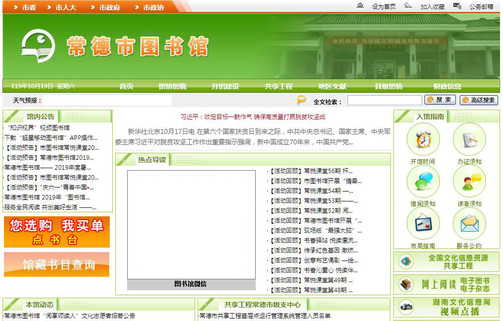 常德市圖書館始建于1903年(清光緒二十九年),雷茂才為首的五位瀏陽籍留日歸來的愛國志士,在現(xiàn)在黃金臺對面的呂祖廟,創(chuàng)辦了第一個面向公眾開放的圖書館,名為“師范傳習(xí)所”,迄今已有110年的歷史。在以“常德市圖書館”命名之前,隨著館址的遷移,館名也一再更替,曾用名有“通俗教育館”、“民眾圖書館”、“教育圖書館”,是我國最早以“圖書館”命名的地市級公共圖書館?,F(xiàn)有館舍于1988年3月對外開放,原中共中央總書記胡耀邦同志題寫了館名。館舍面積8331平方米;總藏書量45.5萬冊,其中古籍線裝書12385冊(最珍貴的有明清刻本3種21冊),各類工具書及地方文獻(xiàn)萬余種。全館有15個服務(wù)窗口對外開放,對讀者實行零門檻的全開架借閱,服務(wù)時間每周71.20小時,年接待讀者30多萬人次,外借書刊 28萬冊次。多樣服務(wù)手段:1、積極推行免費開放。2008年,我館領(lǐng)先全省實行全免費、全開放服務(wù),撤除讀者進(jìn)館“門檻”,圖書外借實行全館“一卡通”。到2010年6月,徹底取消了辦證收費如工本費、補(bǔ)卡費等一切收費項目。2、開通讀者“還書日期短信通知”免費服務(wù)平臺,將讀者借還圖書的短信通知分別訂制在到期的前7天和前3天發(fā)出,為讀者借還圖書提供了方便。3、于2011年推出了讀者“點書臺”專項服務(wù),在服務(wù)總臺旁設(shè)立一個“點書臺”(網(wǎng)站上也開設(shè)相同服務(wù)欄目),讓讀者根據(jù)自己的喜好,點購自己需要而圖書館還沒有收藏的圖書。4、設(shè)立特殊讀者服務(wù)部,解決了殘障讀者群體的閱讀需求。在室內(nèi),我們配備了兩臺電腦、近千冊專業(yè)盲文書籍和500張視聽文獻(xiàn),為他們提供閱覽視聽服務(wù)。5、安裝WIFI。在本館辦公室、多功能報告廳、期刊閱覽室、文學(xué)外借處和未成年人借閱處分別新裝了5個性能處于國內(nèi)領(lǐng)先水平“W20E”信號發(fā)射基站,傳輸速率為450兆/秒,保證了無線網(wǎng)絡(luò)信號全面覆蓋館內(nèi)各處,方便讀者自帶設(shè)備上網(wǎng)學(xué)習(xí),休閑娛樂。6、開放自修室,為滿足市民的自修需求,并照顧部分讀者自帶書籍進(jìn)館閱讀的習(xí)慣,我館在主樓二樓新設(shè)了免費自修室,自修室內(nèi)設(shè)60個舒適的閱讀坐席,還配備了冷暖空調(diào),為讀者提供舒適的自修環(huán)境。7、開通“常德市圖書館”微信平臺。4月17日開通,將我館藏書資源、講座活動、精品圖書等消息推送給廣大讀者,是我館打造以“物理內(nèi)涵、數(shù)字內(nèi)涵、文化內(nèi)涵”為中心的三元結(jié)構(gòu)新型圖書館文化的重要組成部分之一,它體現(xiàn)了圖書館“溫馨化”服務(wù)理念。8、歌德電子圖書借閱機(jī)??梢淮瓮瑫r存儲2000冊正版電子圖書,每個月通過公司書目庫更新200冊,免費下載數(shù)量不限,在本館全館實現(xiàn)無線覆蓋(帶寬50兆)的網(wǎng)絡(luò)下,下載一本電子圖書平均耗時10秒。