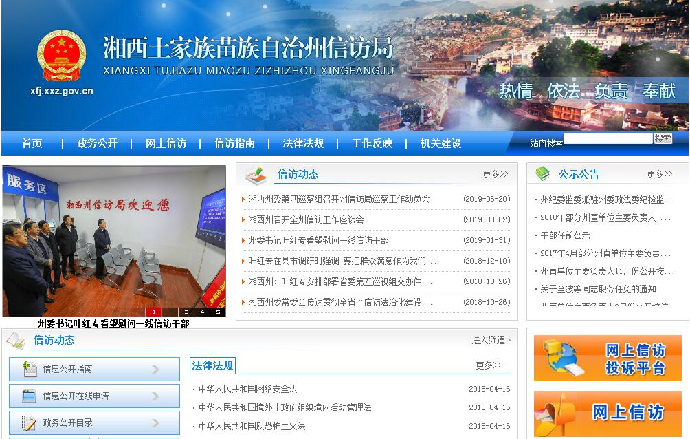 湘西土家族苗族自治州信訪局是州委、州人民政府主管信訪工作的機(jī)構(gòu),正局級(jí),由州委辦公室、州人民政府辦公室共同管理,以州人民政府辦公室管理為主。州信訪局主要職責(zé)是:(一)負(fù)責(zé)處理群眾給州委、州人民政府的來信,接待群眾來訪,保證信訪渠道暢通;及時(shí)準(zhǔn)確地向領(lǐng)導(dǎo)反映來信來訪中提出的重要意見和問題;綜合分析信訪形勢和信息,提供決策的有關(guān)依據(jù)。(二)承辦領(lǐng)導(dǎo)交辦的信訪事項(xiàng),督促檢查領(lǐng)導(dǎo)批示件的落實(shí)情況;向縣市和部門交辦信訪事項(xiàng),督促檢查重要信訪事項(xiàng)的處理和落實(shí)。(三)協(xié)調(diào)處理跨地區(qū)、跨部門的重要信訪問題;協(xié)調(diào)處理群眾集體上訪和異常、突發(fā)信訪案件。(四)指導(dǎo)、督促、檢查全州信訪業(yè)務(wù)工作,提出改進(jìn)和加強(qiáng)信訪工作的意見與建議。(五)負(fù)責(zé)組織州處理信訪突出問題及群體性事件聯(lián)席會(huì)議日常工作。(六)承辦州委、州人民政府交辦的其他事項(xiàng)。