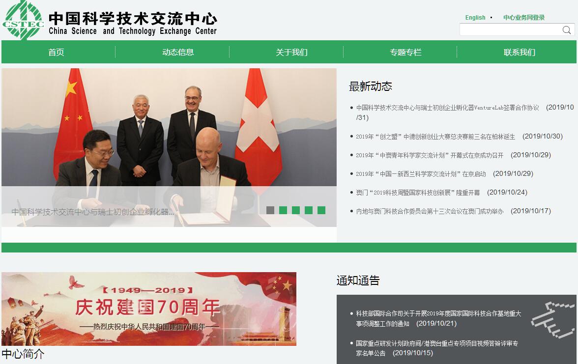 中國(guó)科學(xué)技術(shù)交流中心經(jīng)國(guó)務(wù)院批準(zhǔn)于1982年成立,是中華人民共和國(guó)科學(xué)技術(shù)部領(lǐng)導(dǎo)下的,具有獨(dú)立法人地位的國(guó)家級(jí)對(duì)外科學(xué)技術(shù)交流專業(yè)機(jī)構(gòu)。其宗旨是通過對(duì)外科技交流活動(dòng),促進(jìn)中國(guó)與世界其他各國(guó)和地區(qū)的科技、經(jīng)濟(jì)和社會(huì)發(fā)展等方面的合作與交流,為推動(dòng)中國(guó)經(jīng)濟(jì)發(fā)展和社會(huì)進(jìn)步,增進(jìn)與各國(guó)人民的友誼做出貢獻(xiàn)。歷經(jīng)30 年的發(fā)展,交流中心現(xiàn)已與世界上40多個(gè)國(guó)家和地區(qū)的130 多個(gè)機(jī)構(gòu)及著名企業(yè)集團(tuán)建立了合作關(guān)系,形成了對(duì)美洲和大洋洲、歐洲、亞洲和非洲及港澳臺(tái)地區(qū)合作交流的局面,在國(guó)際和港澳臺(tái)地區(qū)的科技合作與交流中發(fā)揮著重要作用。