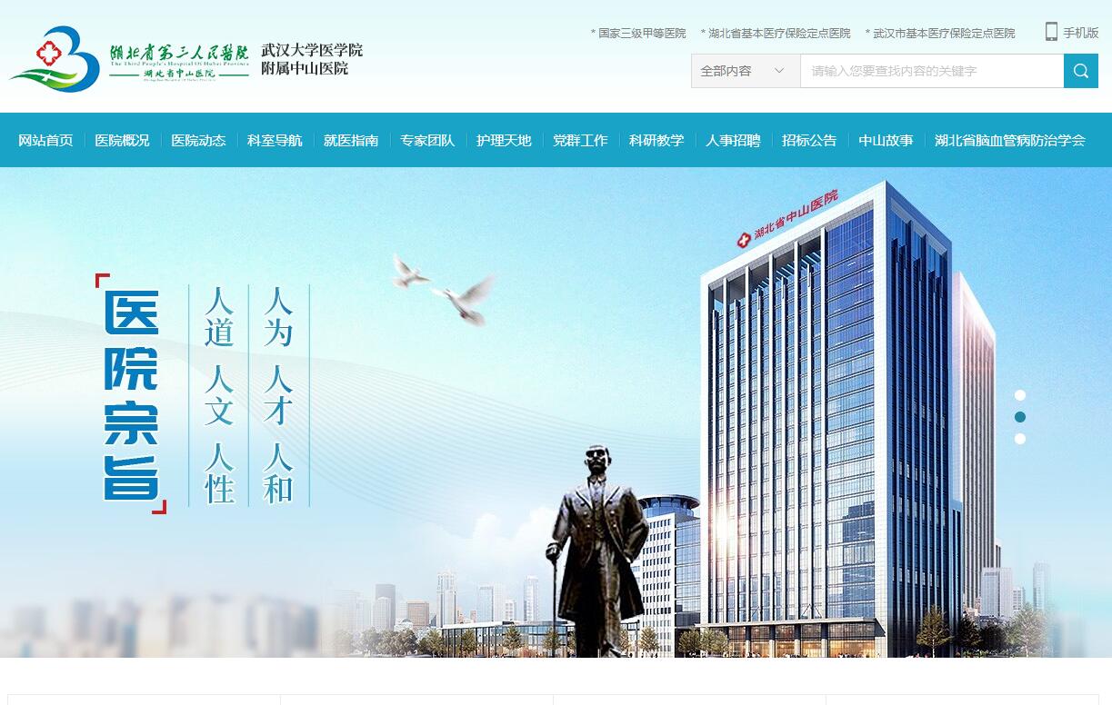 湖北省第三人民醫(yī)院(湖北省中山醫(yī)院)始建于1951年,原名武漢軍工總醫(yī)院。2002年6月,由軍隊管理移交至湖北省衛(wèi)生廳,更名為湖北省中山醫(yī)院。2014年12月,省衛(wèi)生計生委批準醫(yī)院第一名稱變更為湖北省第三人民醫(yī)院。醫(yī)院是政府主辦的全民非營利性醫(yī)療機構(gòu),同屬“武漢大學醫(yī)學院附屬中山醫(yī)院”,是一所集醫(yī)療、科研、教學、預防、康復為一體的綜合性大型三級甲等醫(yī)院,是醫(yī)保和商業(yè)保險定點醫(yī)院、湖北省康復救助項目定點機構(gòu)、國家愛嬰醫(yī)院。2004年9月,偉大的革命先行者孫中山先生的孫女,檀香山中國婦女慈善會會長孫穗芳博士受聘擔任醫(yī)院名譽院長。醫(yī)院設有硚口和陽邏兩個院區(qū),編制床位1800張,職工1900余人,是“湖北省基層衛(wèi)生指導與培訓中心”、“湖北省腦卒中診療中心”、“湖北省腦卒中篩查與防治領導小組辦公室”、“湖北省疼痛醫(yī)療質(zhì)量控制中心”掛靠單位,湖北省互聯(lián)網(wǎng)醫(yī)院。同時也是首批“國家住院醫(yī)師規(guī)范化培訓基地”、國家三級甲等醫(yī)院,是“國家藥品臨床試驗(GCP)基地”、“國家級高級卒中中心”、“衛(wèi)生部腦卒中篩查與防控基地”、“全國肝膽病防治技術示范基地”、“國家級皮膚醫(yī)療美容示范基地”、“全國健康管理示范基地”、“湖北省腦卒中篩查與防治基地”、“湖北省疼痛治療中心”、“武漢市腦癱兒童康復技術指導中心”,湖北省疼痛學會主任委員單位,湖北省肝膽疾病學會中西醫(yī)結(jié)合肝膽病專委會主任委員單位,湖北省殘疾人康復協(xié)會肢體殘疾康復委員會腦癱康復組主任委員單位。神經(jīng)內(nèi)科、疼痛科、醫(yī)學美容科和超聲影像科是湖北省臨床重點???。