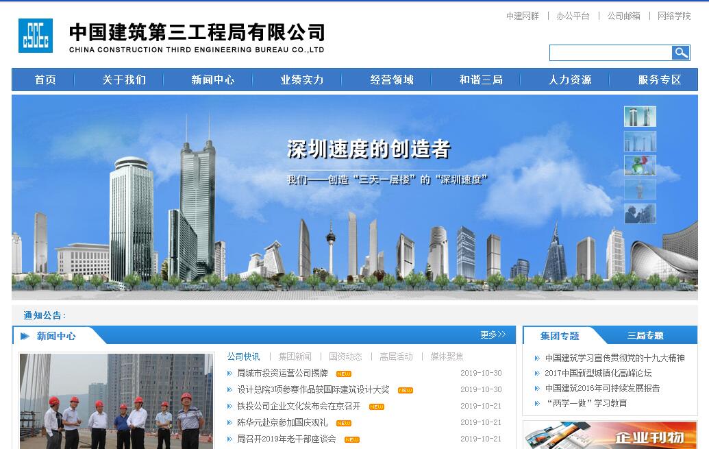 中國建筑第三工程局有限公司(以下簡稱“中建三局”)是在上世紀(jì)60年代國家集中力量加強(qiáng)三線建設(shè)的特定環(huán)境中,1965年經(jīng)國務(wù)院批準(zhǔn)在四川攀枝花成立,1966年調(diào)遷貴州,1975年調(diào)遷湖北,1982年隸屬于中國建筑工程總公司,是世界500強(qiáng)企業(yè)上市公司中國建筑(股票代碼601668.SH)的重要全資子公司。 中建三局旗下?lián)碛薪ㄖこ?、市政公用、公路工程及石油化?大類共計(jì)12項(xiàng)特級資質(zhì),公路行業(yè)、市政行業(yè)、石化行業(yè)、建筑行業(yè)(建筑工程、人防工程)12個(gè)甲級資質(zhì),處于行業(yè)領(lǐng)先水平。公司現(xiàn)有員工30000人,主要二級經(jīng)營單位24家,在建項(xiàng)目千余個(gè),遍布全國主要一、二線城市及巴基斯坦、阿爾及利亞等13個(gè)國家(地區(qū))。企業(yè)綜合實(shí)力多年位居中國建筑業(yè)競爭力百強(qiáng)企業(yè)榜首、湖北百強(qiáng)企業(yè)前三名,先后4次榮膺全國文明單位稱號、4獲全國五一勞動獎狀。累計(jì)獲得218項(xiàng)魯班金像獎(國家優(yōu)質(zhì)工程獎),22項(xiàng)詹天佑獎,居國內(nèi)同行業(yè)同規(guī)模企業(yè)前列,被譽(yù)為“中國建筑優(yōu)秀排頭兵”。2018年,全局實(shí)現(xiàn)合同額4553億元、營業(yè)收入2373億元(含參股)。按照收入指標(biāo)計(jì)算,我局作為中國建筑二級單位達(dá)到世界500強(qiáng)第435位標(biāo)準(zhǔn)、ENR250強(qiáng)國際工程承包商第71位標(biāo)準(zhǔn)、中國企業(yè)500強(qiáng)第46位標(biāo)準(zhǔn)。中建三局秉持“敢為天下先,永遠(yuǎn)爭第一”的企業(yè)品格,于20世紀(jì)80年代在深圳國貿(mào)大廈施工中創(chuàng)造了“三天一層樓”的“深圳速度”,書寫了中國改革開放的代名詞。承(參)建了包括上海環(huán)球金融中心(492米)、北京中國尊(528米)、天津117大廈(597米)在內(nèi)的全國20多個(gè)省區(qū)市的第一高樓,以及被譽(yù)為“世界新十大建筑奇跡”的央視新址CCTV大樓等一大批代表性工程,作為總承包主建或參建的500米以上超高層建筑有7座(全國共8座)。市政基礎(chǔ)設(shè)施業(yè)務(wù)發(fā)展迅速,在市政道路、城市高架橋、跨湖通道、跨江特大橋、軌道交通等方面形成多個(gè)產(chǎn)品序列。中建三局深入推進(jìn)建造+投資“兩輪”驅(qū)動,持續(xù)加大在基礎(chǔ)設(shè)施、房地產(chǎn)、城市綜合開發(fā)、建筑工業(yè)化、地下空間、節(jié)能環(huán)保等領(lǐng)域的投資力度。房地產(chǎn)業(yè)務(wù)進(jìn)入“湖北五強(qiáng)”。在武漢投資興建綠色建筑產(chǎn)業(yè)園,具備完整的建筑工業(yè)化產(chǎn)業(yè)鏈,獲評湖北首個(gè)“國家住宅產(chǎn)業(yè)化基地”。投資開發(fā)“中法生態(tài)城”城市綜合開發(fā)項(xiàng)目。全局年投資額400多億元,累計(jì)完成投資1700多億元。