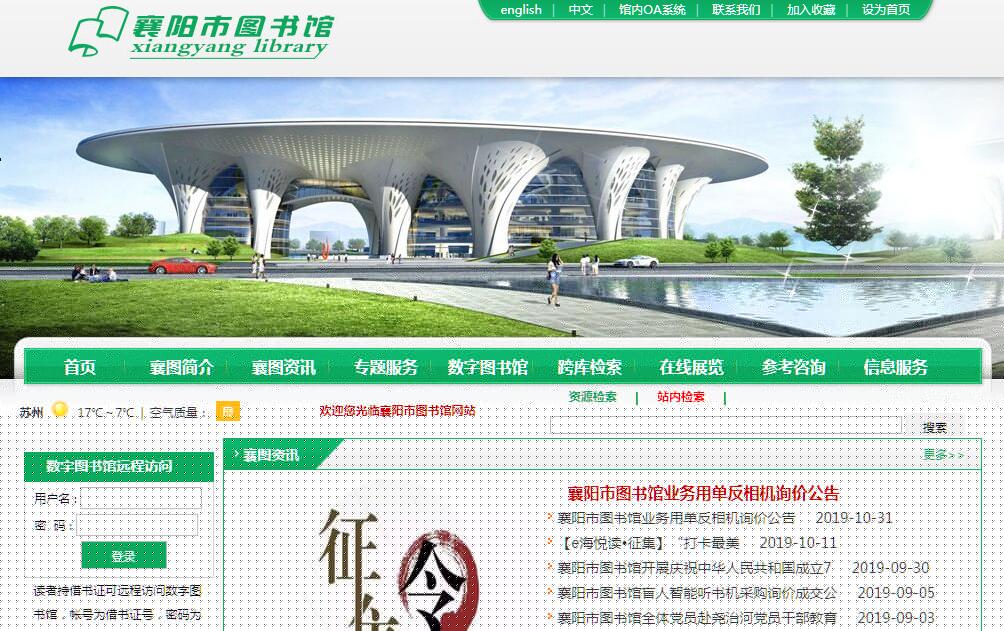 按照全市城建規(guī)劃,襄陽市圖書館新館建設(shè)于2012年9月正式啟動,新館位于東津新區(qū)西崗村,是市政府十大重點公共建設(shè)工程,將按照國家綠色二星級建筑標(biāo)準建設(shè)。該項目于2012年9月立項,總建筑面積為5萬多平方米。概算投資為4億多元。新館設(shè)計閱覽座席為3000座,藏書能力500萬冊,日均接待讀者能力5000人次。新館項目于2013年8月破土動工,計劃將在2018年5月底竣工。1996年4月,繼胡繩藏書館建立之后,又相繼建有地方文獻館、文史資料館、三國館和古籍保護中心,初步形成以“三國”文化、漢水文化為重點,融歷史文化、地方文化為一體的綜合性文獻資源體系。自2013年起,我市開始實施數(shù)字圖書館建設(shè),目前已初步建成覆蓋全市的數(shù)字圖書館虛擬網(wǎng)平臺,應(yīng)用系統(tǒng)平臺和資源展示平臺;實現(xiàn)了與國家圖書館、湖北省圖書館的網(wǎng)絡(luò)互連及資源共享;安裝部署了統(tǒng)一用戶管理系統(tǒng),面向公眾推出了基于移動端的數(shù)字圖書館推廣工程移動閱讀平臺,使廣大讀者能夠更加便捷地享受數(shù)字圖書館的多元化服務(wù)。襄陽市圖書館館藏資源超過20TB,可通過PC和移動端提供16萬種中外文圖書、1萬余種中文期刊、28萬張圖片、23萬篇學(xué)位論文,18萬余篇檔案全文,100余部工具書、5000個英語微視頻、1500集少兒動畫、1600余集少兒繪本、10萬余首古典音樂及海量特色古籍善本的數(shù)字資源。襄陽市圖書館陸續(xù)建設(shè)“襄陽老照片數(shù)據(jù)庫”、“漢水文化特色資源庫”、“襄陽市政府公開信息”等自建數(shù)據(jù)庫,推出“云屏數(shù)字借閱機”、“書香襄陽數(shù)字圖書館”、“有聲數(shù)字圖書館”、“新東方多媒體學(xué)習(xí)庫”、“智課教育英語學(xué)習(xí)平臺”、“立法決策服務(wù)平臺”、“數(shù)字國學(xué)館”等多項資源內(nèi)容,啟用掌上襄圖手機網(wǎng)站、移動圖書館、數(shù)字圖書館推廣工程移動閱讀平臺、微信圖書館等資源服務(wù),從圖書借閱、資源導(dǎo)航、好書推薦、文化交流等多個方面、滿足不同讀者的多元化需求。 古籍現(xiàn)有藏量5.11萬冊,5076部。其中有10部共122冊古籍善本入選“國家珍貴古籍名錄”。20部入選“湖北省珍貴古籍名錄”。2011年5月1日實行免費開放服務(wù)后,市圖書館本著“讀者第一,服務(wù)為本”的原則,以“以人為本,開門辦館,創(chuàng)新服務(wù),提升形象”為工作思路,堅持創(chuàng)新特色服務(wù)、完善人性化的服務(wù)設(shè)施。全年365天堅持免費對讀者開放,每周開放84小時,為讀者提供文獻借閱、信息咨詢、公益講座、讀者閱讀活動、數(shù)字資源利用等服務(wù)。2016年全年共舉辦公益性講座78場次,參與的聽眾達3萬余人次,其中:“漢江講壇”20場次,“漢江講壇”特別講座3場次;“市民大講堂”18場次,“市民大講堂”延伸場次9場次;“市民沙龍”18場次;中華詩詞講座10場次。這些文化公益講座,在襄陽文化學(xué)術(shù)教育界和市民之間架起了一座文化橋梁,已成為襄陽市讀者服務(wù)工作的優(yōu)秀品牌。我館利用市圖書館網(wǎng)站、通微信、微博公眾平臺,定期向讀者推送新書推介、查詢續(xù)借、讀者服務(wù)、活動預(yù)告、圖書館動態(tài)、小皮匠悅讀園、英語角、小諸葛讀書會等具有特色的讀者活動,深受讀者喜歡。微信平臺年讀者關(guān)注人數(shù)達10000余人次,總閱讀量超過50萬次。 按照 “書香溢襄陽” 的建設(shè)目標(biāo),市圖書館于2009年起,在市區(qū)建設(shè)社區(qū)圖書流動站和圖書漂流站,同時,開展流動圖書車進學(xué)校、進軍營和壟上行走鄉(xiāng)村的送書活動。截至2016年底,已建成社區(qū)圖書流動站201個,設(shè)置圖書漂流站10個。圖書流動站和流動車年外借書刊21萬余冊,年接待讀者18萬人次以上。圖書館總分館20個(其中:7個縣級圖書館、11個社區(qū)圖書室、2臺24小時自助圖書館)。絡(luò)。襄陽市圖書館工作分別被《人民日報》、《光明日報》、《湖北日報》、《楚天都市報》、《襄陽日報》、《襄陽晚報》等多家媒體報道,先后獲得“全國文化系統(tǒng)先進集體”、“‘文化志愿服務(wù)推進年’系列活動示范項目”、 “全民閱讀先進單位”、“省級文明單位”、“全省十佳圖書館”、“全省十佳閱讀基地”、“團省委青少年維權(quán)崗先進單位”、“湖北省三八紅旗集體”、“全市先進黨組織”、“全市好班子”、“全市宣傳思想工作先進單位”、“全市平安單位”、“全市工會女職工創(chuàng)業(yè)爭先標(biāo)兵崗先進單位”、“全國青少年 維權(quán)崗”等各項集體榮譽稱號。被國家文化部命名為地市級公共圖書館一級館,被國務(wù)院授予“第四批全國古籍重點保護單位”,被全國文化信息資源共享工程中心授予市級分中心稱號。館長高軍被國家文化部、人力資源和社會保障部表彰為全國文化系統(tǒng)先進個人稱號。