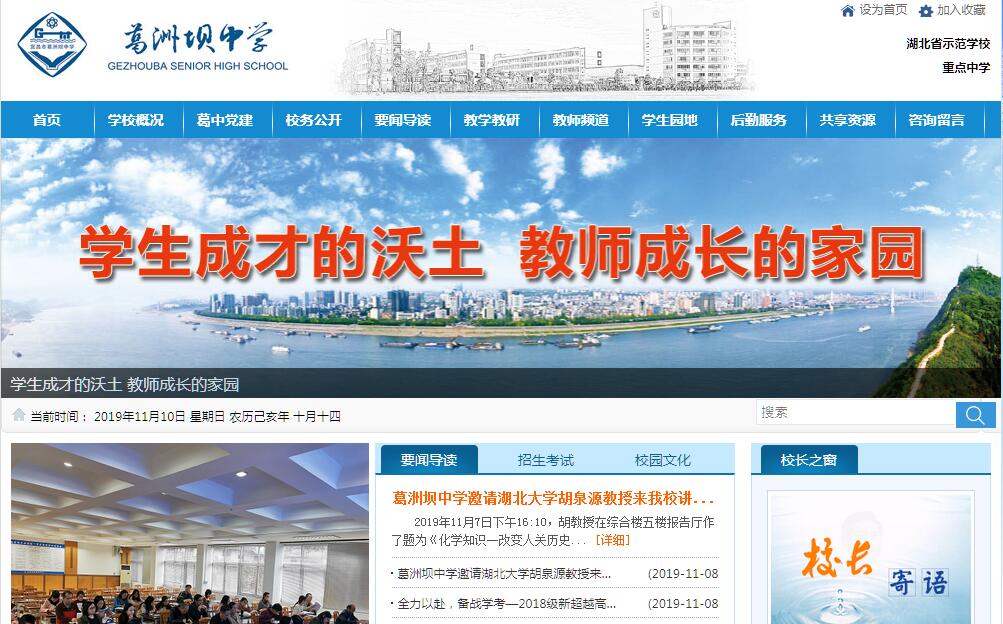 宜昌市葛洲壩中學(原葛洲壩六中、葛洲壩高級中學、宜昌市第二十中學)是中國葛洲壩集團公司于1981年正式創(chuàng)辦的一所重點高中。1993年躋身湖北省28所重點中學行列,是與武鋼三中等知名學校齊名的重點中學。2000年被湖北省人民政府教育督導室命名為“示范學?!?。辦學以來,學校為國家培養(yǎng)了大批優(yōu)秀人才,先后向北大、清華輸送30多名優(yōu)秀學生,向中科大、武大、華科大等高校輸送了20名少年大學生;產(chǎn)生了9名宜昌市文科、理科、外語類高考狀元。學校167名教職工中,特級教師1人,正高職教師4人,“宜昌名師”6人,省骨干教師和宜昌市學科帶頭人12人,高級教師71人,碩士研究生38人,為宜昌市教師高學歷比例最高的學校。學校是全市唯一一所榮獲“三峽質(zhì)量獎”提名獎的學校,先后榮獲全國“群眾體育運動先進單位”、“校園環(huán)境文化藝術(shù)建設(shè)先進單位”、“全國教育科研先進單位” 榮譽稱號;榮獲湖北省“文明單位”、“新課程改革先進學?!薄ⅰ昂笔∑桨残@”、“湖北省校園文化建設(shè)百強學?!?、“比訪工作先進學校”、“校園管理優(yōu)秀學?!睒s譽稱號;榮獲宜昌市“教育質(zhì)量獎”、“群眾滿意的中小學”、“優(yōu)秀學校”、“廉政文化進校園示范點”、“美麗校園”、“宜昌市先進基層黨組織”等榮譽稱號。