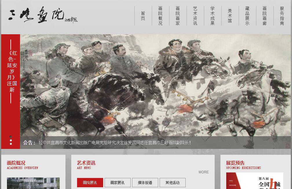 宜昌美術(shù)館(宜昌市三峽畫院)成立于1994年,集研究、創(chuàng)作交流、展覽、收藏為一體的文化事業(yè)單位,現(xiàn)有干部職工5人(高級(jí)職稱3人、中級(jí)職稱2人),畫院特聘畫家50人(其中中國(guó)美協(xié)會(huì)員10人、湖北省美協(xié)會(huì)員28人)。下設(shè)有辦公室、創(chuàng)作部、通聯(lián)部、營(yíng)銷部、展覽中心等機(jī)構(gòu)和場(chǎng)所。全國(guó)政協(xié)委員、中央文史館書畫院研究員、農(nóng)工民主黨中央文委會(huì)委員、中國(guó)美協(xié)藝委會(huì)委員、國(guó)家一級(jí)美術(shù)師汪國(guó)新為現(xiàn)任院長(zhǎng)、法人代表。三峽畫院自建院以來 ,在各級(jí)領(lǐng)導(dǎo)關(guān)心和社會(huì)各界的支持下,在藝術(shù)界同仁的共同努力下,以弘揚(yáng)中華民族優(yōu)秀文化、繁榮書畫藝術(shù)為宗旨,“展三峽風(fēng)采,創(chuàng)三峽畫派”,常年陳列畫院藏品、定期舉辦學(xué)術(shù)展覽;堅(jiān)持以學(xué)術(shù)為導(dǎo)向,組織藝術(shù)家從事美術(shù)創(chuàng)作、學(xué)術(shù)研究及開展藝術(shù)交流活動(dòng),介紹畫院畫家及其優(yōu)秀的藝術(shù)作品,搭建藝術(shù)展示平臺(tái)。長(zhǎng)江孕育了古老的民族和悠久的文化,造就了永垂史冊(cè)的文人墨客,也培育出了一大批活躍在當(dāng)代藝術(shù)領(lǐng)域的優(yōu)秀藝術(shù)家,他們的作品多次參加全國(guó)性的展覽并獲獎(jiǎng),應(yīng)邀在法國(guó)、德國(guó)、西班牙、日本、東南亞各國(guó)舉辦個(gè)人畫展,進(jìn)行學(xué)術(shù)交流,宣傳中國(guó)文化。三峽畫院始終堅(jiān)持先進(jìn)文化的發(fā)展方向,為三峽流域的美術(shù)事業(yè)發(fā)展,構(gòu)建和諧社會(huì)做出了應(yīng)有的貢獻(xiàn)。