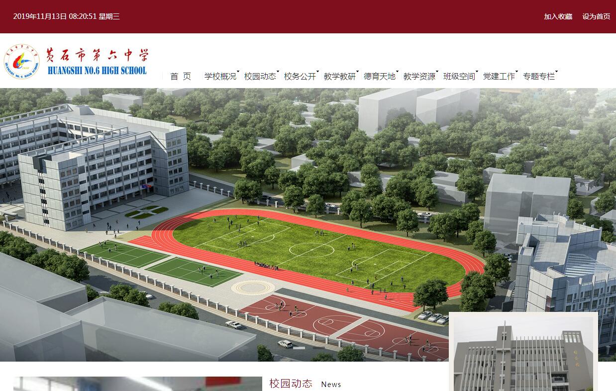 黃石市第六中學位于西塞山區(qū)黃石大道臨江街155號,北鄰長江外灘,南倚風光秀麗的黃荊山,是黃石市教育局八所直屬高中之一。黃石六中創(chuàng)辦于1958年6月,1958年到1978年,學校以初中為主,從1978年開始,重點辦高中教育,恢復高考后,上世紀八十年代教育質(zhì)量在全市名列全茅。到2006年,學校達到了39個教學班,在校生達到2600多人。學校先后有煤炭一中高中部、下陸中學部分、黃石二十中部分并入。學校先后獲得市級文明單位、綜合治理先進單位、市安全文明校園、市安全生產(chǎn)先進單位、市級五好班子、市高招工作先進單位、省衛(wèi)生先進單位、省毒品預防教育示范學校、省重點課題研究先進單位等榮譽稱號。高考成績連續(xù)實現(xiàn)新突破,連續(xù)兩年獲市教學質(zhì)量提高獎,2013年獲得市教育局“教學質(zhì)量目標管理獎”,學校形成了“低進高出、高進優(yōu)出、小班教學、整體提高”和“全接納、慢引導、巧優(yōu)化”的教學特色。體育、藝術類特色明顯,近年一批優(yōu)秀的特長生被中央美院、湖北美院、武漢音樂學院等院校錄取。華中師范大學、湖北師范學院已在學校建立了藝術特長生的培訓基地。學校在崗教職工149人,其中高級教師61人,占41%。市級骨干教師3 人,黃石市學科學術帶頭人 2人,黃石市“五一勞動獎章”獲得者2人。近三年來,多人次獲得國家級、省級優(yōu)質(zhì)課競賽一等獎,在多種類型學術刊物上發(fā)表高質(zhì)量論文多篇。學校占地面積1.9萬平方米,建筑面積1.2萬平方米,配有標準化的理化生實驗室、圖書館、音樂美術教室、多媒體會議室、計算機室,建有校園廣播系統(tǒng),自飲水系統(tǒng)。全部班級配備電子白板,安裝了空調(diào)、監(jiān)控設備。新建的綜合樓建筑面積5300平方米,新樓擁有可同時容納350人就餐的食堂,標準寢室 36 間以及功能室12間。學校300米塑膠跑道項目正在建設中。