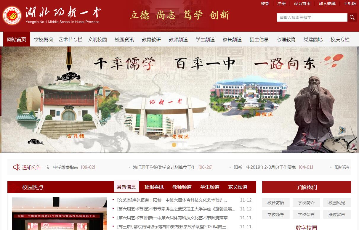 陽新縣第一中學(xué),位于湖北省黃石市陽新縣,是湖北省教育廳確定首批辦好的108所重點(diǎn)中學(xué)之一,湖北省新課改樣本校,湖北省校園文化百強(qiáng)校、湖北省科技創(chuàng)新實(shí)驗(yàn)學(xué)校、湖北省綠色校園、湖北省文明單位(校園)、全國青少年人工智能活動(dòng)特色單位、全國零犯罪學(xué)校,全國生態(tài)教育示范校,中華詩教先進(jìn)單位。學(xué)校前身是創(chuàng)建于公元1910年(清宣統(tǒng)二年)的興國州中學(xué)堂,數(shù)易其址、幾更校名,從陽新中學(xué)校、中正公學(xué)、湖北省陽新縣立初級(jí)中學(xué)、陽新縣初級(jí)中學(xué)、陽新城關(guān)中學(xué)、到陽新縣第一中學(xué)等歷史時(shí)期,1989年秋,陽新一中整體從儒學(xué)垴搬遷到縣城東北郊蓮花湖畔。2017年秋,陽新一中分為兩個(gè)校區(qū),新校區(qū)位于城東教育城。目前,學(xué)校共有99個(gè)教學(xué)班,在校學(xué)生5700余人,教職工470余人。傳百年儒學(xué)薪火,博采百家,贏來百譽(yù),百載惠風(fēng)吹黌門;創(chuàng)一流荊楚名校,相承一脈,潤澤一方,一園春色滿杏壇。百年儒學(xué)涵養(yǎng)著她興國古州的神韻;紅色大地蘊(yùn)藏著她富川山水的靈氣??箲?zhàn)炮火的硝煙里,她頑強(qiáng)拼搏,砥礪奮進(jìn);教育改革的大潮中,她銳意進(jìn)取,弄潮爭(zhēng)先。當(dāng)前“一中人”正為著全市做標(biāo)桿,全省起示范,全國有影響的荊楚名校夢(mèng)而努力奮斗在前行的路上。