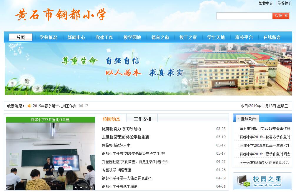 銅都小學是一所新更名的學校,學校座落在美麗的東方山南麓,校園環(huán)境優(yōu)美,綠樹成蔭,四季花開,布局典雅,文化氣息濃郁,是學生健康快樂成長的理想搖籃。學校前身為九年一貫制的下陸三中。2014年8月進行布局調整,將原下陸三中初中部與有色中學合并,同時更名為“黃石市銅都小學”。學校占地面積46000平方米,建筑面積15000多平方米,是一所花園式學校。學校擁有全市義務教育學校一流的標準化運動場,場地開闊,環(huán)境優(yōu)美,布局典雅,風格獨特,文化氣息濃郁,是培育人才的理想搖籃。學校功能室齊備,有音樂室、美術室、科學實驗室、微機室、圖書室、書法室、機器人室和多功能報告廳等“九室一廳”。所有功能室門牌標示準確清晰,且實行專室專用。學?,F(xiàn)有26個教學班,在籍學生1300多人,在編教職工67人。其中,高級職稱人員7人,中級職稱人員56人。短短兩年,銅都小學在首屆領導班子的帶領下,不斷收獲教學成果,學生獲獎捷報頻傳:學校先后被授予為“黃石市少先隊工作示范學?!?、“黃石市綠色學校”、“黃石市民防知識教育示范學校”、“黃石市毒品預防示范學?!?、“黃石市安全文明校園”、“湖北省消防安全示范學?!薄ⅰ叭珖闱蛱厣珜W?!薄ⅰ昂笔〗逃到y(tǒng)關心下一代工作先進集體”、“黃石市文明學?!薄ⅰ包S石市十星級學?!钡葮s譽稱號。在黃石市體育傳統(tǒng)項目學校田徑對抗賽中,我校田徑隊獲得金牌2枚,銀牌4枚,銅牌3枚,4個四至八名的佳績;在黃石市“第三屆小學生古詩詞背誦大會”中榮獲二等獎;在黃石市首屆“綠城 玉蘭花園”杯小學生消費維權主題比賽中,我校學生在征文、繪畫、手抄報榮獲一等獎6人次,二三等獎14人,4名老師榮獲優(yōu)秀輔導老師,學校榮獲優(yōu)秀組織獎;另外,在黃石市及下陸區(qū)組織的教師業(yè)務競賽中有13人(次)獲得一、二、三等獎。借助十三五規(guī)劃的東風,銅都小學人將繼續(xù)發(fā)揚艱苦創(chuàng)業(yè)的拼搏精神、精誠合作的團隊精神、潤物無聲的奉獻精神、敢為人先的創(chuàng)新精神,沐浴課改春風,優(yōu)化管理模式,強化服務意識,打造教育品牌,共同去創(chuàng)造下陸教育的輝煌!