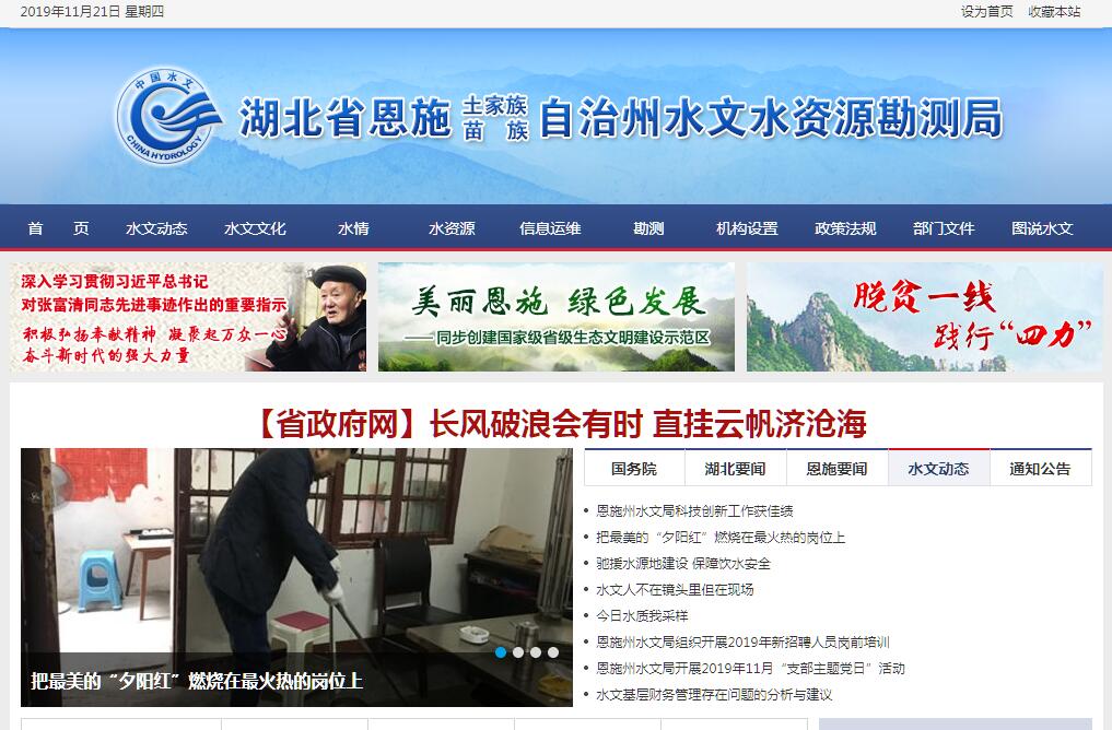 恩施州水文水資源勘測局始建于1933年,原名“恩施地區(qū)水文分站”,隸屬于湖北省水文水資源局,為省垂直管理的全額撥款事業(yè)單位。主要工作職責是負責全州水文站網(wǎng)規(guī)劃與建設(shè),水文監(jiān)測與預(yù)報,水資源調(diào)查與評價,水文監(jiān)測資料匯交、保管與使用,水文設(shè)施與水文監(jiān)測環(huán)境的保護,水文監(jiān)督管理等。在服務(wù)防汛抗旱、水資源管理、水環(huán)境保護、生態(tài)建設(shè)、水工程建設(shè)和國民經(jīng)濟建設(shè)等方面肩負著重要使命。單位內(nèi)設(shè)綜合辦公室、勘測科、水情科(內(nèi)含國家防汛抗旱指揮系統(tǒng)恩施水情分中心)、信息科、水資源科、財務(wù)科 6個職能科室,下設(shè)咸豐縣水文局、恩施市水文局2個縣級局?,F(xiàn)有在職職工82人,退休職工53人,合計135人。在職職工中,專業(yè)技術(shù)人員占比81.7%,大專及以上學(xué)歷占比89%。機關(guān)內(nèi)設(shè)6個職能科室,下設(shè)2個縣級水文局、9個國家基本水文站,現(xiàn)擁有各類水文站點543處。承擔向國家防總、省防辦、長江水利委員會、重慶市、湖南省、三峽工程、清江梯級開發(fā)及恩施州防辦、各縣市防辦等單位的報汛任務(wù)。單位加掛湖北省水資源水環(huán)境監(jiān)測中心恩施分中心牌子。該分中心為國家計量認證合格單位,擁有雄厚的技術(shù)力量和豐富的儀器設(shè)備,在地表水、地下水、生活飲用水、污水、大氣降水五大類中,具備向社會提供公正檢測數(shù)據(jù)成果的能力。單位擁有“水文、水資源調(diào)查評價”資質(zhì)和“建設(shè)項目水資源論證”資質(zhì),具備提供水文水資源社會咨詢服務(wù)的資格和能力。開展了大量的水文分析計算、編制防洪調(diào)度方案、提供水文情報預(yù)報服務(wù)、水資源調(diào)查評價、水資源論征、防洪影響評價、水環(huán)境監(jiān)測等服務(wù)工作。多年來,認真履行行業(yè)職責,積極主動為地方經(jīng)濟社會發(fā)展提供水文服務(wù),積極開展黨建及文明創(chuàng)建工作,得到了各級黨委政府和主管部門的充分肯定。