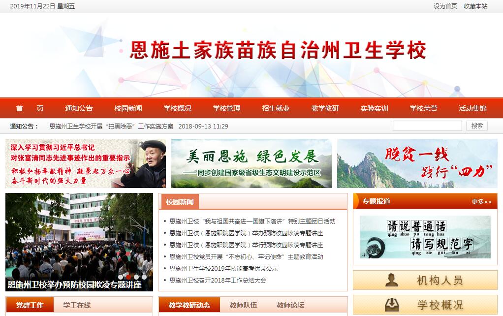 恩施州衛(wèi)生學(xué)校是現(xiàn)在恩施土家族苗族自治州唯一的一所湖北省省級重點中等職業(yè)學(xué)校,坐落在恩施州風(fēng)景秀麗的五峰山上,其前身為1938年美國基督教路德會創(chuàng)辦的高級護(hù)士學(xué)校,距今已有77年的歷史,培養(yǎng)了數(shù)以萬計的白衣天使。自辦學(xué)以來,學(xué)校秉承從嚴(yán)治校的傳統(tǒng),不斷改革創(chuàng)新、與時俱進(jìn),為湖北省、州、縣市醫(yī)療衛(wèi)生機(jī)構(gòu)輸送了大量優(yōu)秀的醫(yī)務(wù)工作者。學(xué)校開設(shè)有護(hù)理、助產(chǎn)、藥劑、醫(yī)學(xué)檢驗技術(shù)、康復(fù)技術(shù)、農(nóng)村醫(yī)學(xué)等專業(yè),是一所公辦優(yōu)質(zhì)、特色鮮明的省級重點中專。近年來,學(xué)校以中專教育為依托,與三峽大學(xué)、湖北中醫(yī)藥大學(xué)、荊州職業(yè)技術(shù)學(xué)院、隨州職業(yè)技術(shù)學(xué)院等高等院校廣泛聯(lián)合辦學(xué),形成了中專、大專、本科多層次的辦學(xué)格局,2015年與荊州職業(yè)技術(shù)學(xué)院聯(lián)辦藥劑專業(yè)“3+2”模式??平逃?。學(xué)校立足恩施,面向基層,服務(wù)醫(yī)療衛(wèi)生事業(yè)發(fā)展,致力于培養(yǎng)“德技雙馨”的衛(wèi)生類專業(yè)高素質(zhì)技術(shù)人才。
