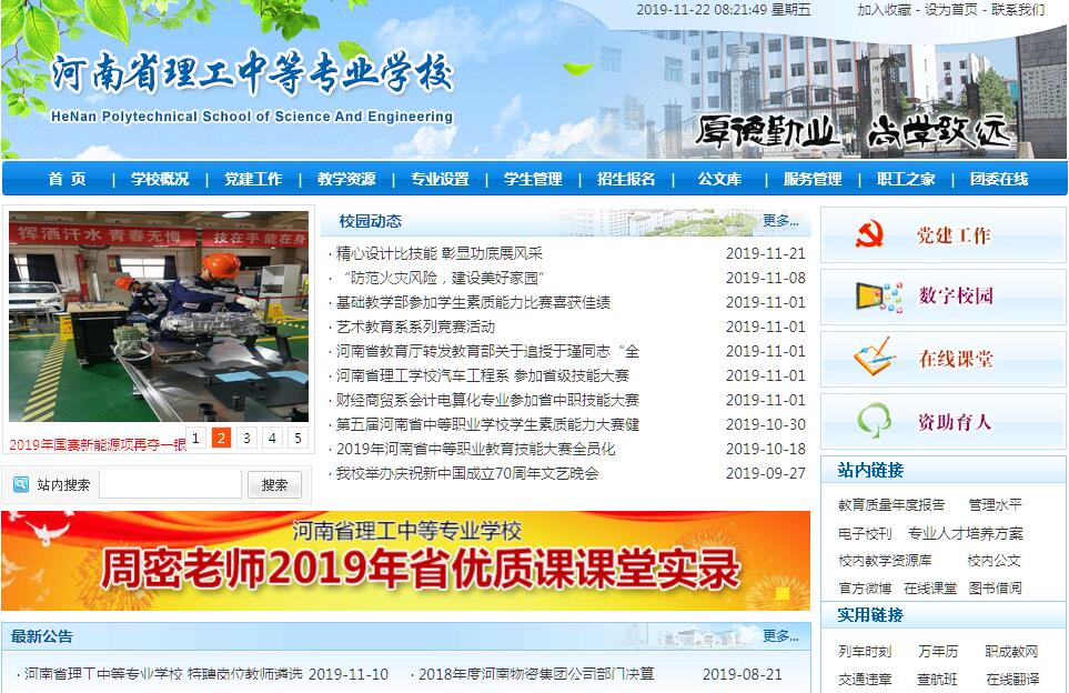 河南省理工學(xué)校(原河南省物資學(xué)校),是一所經(jīng)河南省人民政府批準(zhǔn)并在教育部備案的擁有多類別多專業(yè)的公辦全日制普通中專。學(xué)校創(chuàng)建于1984年,位于鄭州市東風(fēng)渠畔,茂花路6號,交通便利,環(huán)境優(yōu)雅。學(xué)校占地面積110余畝,建筑面積8.2萬平方米?,F(xiàn)有教職工215名,其中高級職稱52名,中級職稱81名,在校學(xué)生4800余人。近年來,我校先后被評為“國家級重點(diǎn)中?!薄ⅰ笆〖壩拿鲉挝弧?、“全國職業(yè)技術(shù)學(xué)校職業(yè)指導(dǎo)工作先進(jìn)學(xué)校”、“省職業(yè)指導(dǎo)與就業(yè)服務(wù)示范單位”、“河南省職業(yè)教育先進(jìn)集體”、 “省級文明學(xué)校”、“河南省教育教學(xué)研究工作先進(jìn)單位”、“河南省最具影響力的十佳職業(yè)學(xué)?!?、“首批河南省誠信規(guī)范招生示范院校”、“河南省職業(yè)教育品牌示范學(xué)?!?。設(shè)施:學(xué)校各類設(shè)施齊全,教學(xué)條件優(yōu)越。建有校園網(wǎng)、多媒體、計算機(jī)中心等先進(jìn)的現(xiàn)代化教學(xué)系統(tǒng),有汽車維修、現(xiàn)代物流實(shí)訓(xùn)中心,有機(jī)床(車、銑、刨及數(shù)控)加工、焊接、鉗工、服裝制作等實(shí)習(xí)車間。有電工電子、PLC、電機(jī)控制、計算機(jī)網(wǎng)絡(luò)、電子商務(wù)、會計、服裝設(shè)計、語音室、形體訓(xùn)練房、琴房等30多個專業(yè)實(shí)驗(yàn)實(shí)訓(xùn)室。擁有運(yùn)動場和現(xiàn)代化的大禮堂。圖書館藏書16萬余冊,設(shè)有教師閱覽室、學(xué)生閱覽室和電子閱覽室。管理:為了更好地培養(yǎng)和教育學(xué)生,我校在教學(xué)、學(xué)生管理和學(xué)生生活等方面都有比較嚴(yán)格的規(guī)定,采取了一系列加強(qiáng)管理的措施。建立專職班主任和教師兼職班主任相結(jié)合的方式。學(xué)校對學(xué)生實(shí)行半封閉式管理,嚴(yán)禁學(xué)生外出(周末除外)、外宿,并配套有嚴(yán)格的全天考勤制度。學(xué)校不許學(xué)生抽煙、渴酒、鋪張浪費(fèi);要求學(xué)生舉止文明,講究衛(wèi)生。所有這些都為學(xué)生創(chuàng)造了良好的學(xué)習(xí)和生活環(huán)境。教學(xué):學(xué)校擁有一支省級教育專家、省級和校級學(xué)科帶頭人和骨干教師組成的具有豐富教學(xué)經(jīng)驗(yàn)、實(shí)踐經(jīng)驗(yàn)和較高學(xué)術(shù)造詣的教師隊(duì)伍。始終以就業(yè)為導(dǎo)向,注重學(xué)生實(shí)際動手能力和技能培養(yǎng),使學(xué)生熟練掌握一門技能。我校是國家教育部、交通部等部委認(rèn)定的承擔(dān)汽車運(yùn)用與維修專業(yè)技能型緊缺人才培養(yǎng)的院校之一,是全省中等職業(yè)學(xué)校物流及電子商務(wù)類專業(yè)教研中心,汽車運(yùn)用與維修、計算機(jī)應(yīng)用專業(yè)為省重點(diǎn)專業(yè);現(xiàn)代物流管理、計算機(jī)財務(wù)會計等專業(yè)為我校傳統(tǒng)優(yōu)勢專業(yè)。學(xué)校特別要求學(xué)生在校期間必須取得汽車維修、計算機(jī)操作、電子商務(wù)、會計電算化、維修電工等相應(yīng)專業(yè)的職業(yè)技能資格證書。在河南省教育廳舉辦的歷屆全省職業(yè)學(xué)校學(xué)生技能大賽上,我校參賽者均取得優(yōu)異成績。就業(yè):我校為國家計劃內(nèi)招生,學(xué)生畢業(yè)后由省教育廳頒發(fā)國家承認(rèn)的學(xué)歷證書和就業(yè)報到證。學(xué)校一直高度重視畢業(yè)生就業(yè)工作,具有完善高效的就業(yè)指導(dǎo)與就業(yè)服務(wù)體系。1999年,河南省人事廳批準(zhǔn)在我校成立了我省唯一的“河南中等專業(yè)人才市場”。多年來,在為我校畢業(yè)生提供優(yōu)質(zhì)的就業(yè)服務(wù)的同時,現(xiàn)已成為河南省具有廣泛影響力的中等專業(yè)人才輸出基地。同時我校與省人民政府駐上海、廣州等辦事處聯(lián)合,與上海英業(yè)達(dá)、達(dá)豐電子、日立電器、河南安飛、環(huán)宇集團(tuán)等省內(nèi)外知名企業(yè)聯(lián)系設(shè)立長期合作就業(yè)基地。學(xué)生入學(xué)后均可與學(xué)校簽訂就業(yè)協(xié)議保證充分就業(yè)。多年來,學(xué)校畢業(yè)生就業(yè)率均達(dá)98.7%以上。