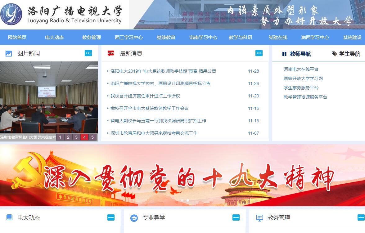 洛陽廣播電視大學(xué)是一所根據(jù)現(xiàn)代教育理論和利用現(xiàn)代電子技術(shù)進(jìn)行遠(yuǎn)程教育的開放性高等學(xué)校。校址位于十三朝古都洛陽市中心西工區(qū)凱旋東路,交通方便,環(huán)境優(yōu)美。學(xué)校創(chuàng)辦于1979年,為正縣級教育事業(yè)單位。現(xiàn)有中層處室8個,分為校本部和洛南新區(qū)兩個校區(qū)。占地面積60余畝,擁有兩座共8400平方米的教學(xué)大樓、4000平方米的學(xué)生宿舍樓、3600平方米的教工宿舍樓,功能齊備的學(xué)生餐廳和寬闊的運動場地。全市縣級電大分校和教學(xué)點14個,電大系統(tǒng)在職教職工300余人;校本部教職工61人,其中副高以上職稱6人,中級職稱25人,專兼職教師80人。建校28年來,共開設(shè)本科專業(yè)13個、??茖I(yè)49個、中專專業(yè)34個,在校生8000余人。現(xiàn)已具有開放教育本科、開放教育專科、成人高等教育專科、網(wǎng)絡(luò)學(xué)院、成人中專、高教自考、職業(yè)培訓(xùn)等多種教育形式,形成了多層次、多規(guī)格、多形式的辦學(xué)格局。截止2006年底,共培養(yǎng)本科畢業(yè)生1800余人,大專畢業(yè)生30000余人、中專畢業(yè)生近6000人。他們遍布我市各行各業(yè),不少人已成為本單位的領(lǐng)導(dǎo)骨干、業(yè)務(wù)骨干和技術(shù)骨干。學(xué)校以網(wǎng)絡(luò)及多媒體視聽為主要教學(xué)手段,具有教學(xué)形式活、講授知識新、傳播速度快、教師水平高等特點。近年來,學(xué)校加快了遠(yuǎn)程教育基礎(chǔ)建設(shè)的步伐,先后投資近130萬元,建成了包括衛(wèi)星接收系統(tǒng)、遠(yuǎn)程雙向?qū)崟r教學(xué)系統(tǒng)、內(nèi)部辦公的綜合性校園網(wǎng)及配套的遠(yuǎn)程教育設(shè)施,通過互聯(lián)網(wǎng)絡(luò)實現(xiàn)了電大系統(tǒng)教學(xué)資源的共享。目前學(xué)校已擁有完善的衛(wèi)星、VBI、IP系統(tǒng),各種教學(xué)資源可以及時接收、保存和發(fā)布。已建成了多媒體教室、網(wǎng)絡(luò)教室、語音教室、多媒體視聽閱覽室、計算機(jī)實驗室、CAI課件室、演播室及校內(nèi)閉路電視系統(tǒng)、雙向視頻系統(tǒng)、電話和電子答疑系統(tǒng),并自主開發(fā)了開放教育在線平臺,基本建成了衛(wèi)星電視系統(tǒng)和計算機(jī)網(wǎng)絡(luò)相配合的交互式現(xiàn)代遠(yuǎn)程教育教學(xué)系統(tǒng),初步實現(xiàn)了從第二代到第三代遠(yuǎn)程教育的飛躍。學(xué)校全面貫徹黨的教育方針,堅持“以教學(xué)為中心,全面提高教育質(zhì)量,為當(dāng)?shù)亟?jīng)濟(jì)建設(shè)和社會發(fā)展培養(yǎng)合格人才”的辦學(xué)指導(dǎo)思想,艱苦奮斗,積極開拓,努力改善辦學(xué)條件,圍繞培養(yǎng)學(xué)生的技能和創(chuàng)新精神,不斷深化教學(xué)改革,全面加強(qiáng)教學(xué)管理,各項工作均取得明顯成績,連年被省電大評為教學(xué)、教學(xué)管理、考務(wù)管理先進(jìn)單位;先后獲得河南省教委“優(yōu)秀學(xué)?!?、中央電大“全國廣播電視大學(xué)信得過考區(qū)”、“全國教育網(wǎng)站系統(tǒng)示范單位”、“全省電大系統(tǒng)先進(jìn)辦學(xué)單位”等稱號。