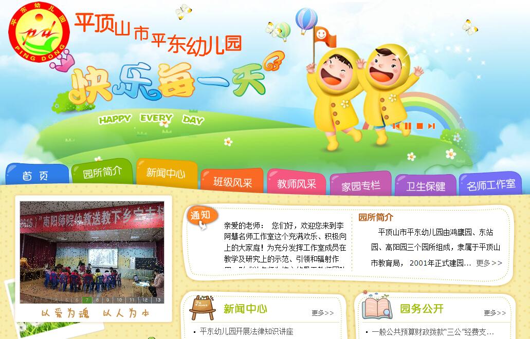 平頂山市平東幼兒園由鴻鷹園、東站園、高陽園三個園所組成,隸屬于平頂山市教育局, 2001年正式建園,是平頂山市區(qū)東部最大的一所公辦幼兒園。三園占地面積近10000平方,共有26個教學班,900余名幼兒,教職工110余名。全園教師學歷達標率100%,其中省級名師3人,省級骨干教師4人,省學術技術帶頭人2人,市級骨干教師4名,省級優(yōu)秀教師1名,中學高級教師4名,小學高級教師10名。幼兒園先后榮獲省級文明單位、省級示范幼兒園、省級衛(wèi)生先進單位、省教育系統(tǒng)先進家長學校、省依法治校先進學校、省級食品衛(wèi)生A級單位、市德育先進集體、市教科研先進單位、市平安校園建設先進集體等榮譽稱號。鴻鷹幼兒園坐落在建設路東段鴻鷹小區(qū)內(nèi)中心花園西側(cè),開設11個教學班,在園幼兒400余名。東站幼兒園位于平頂山東站西側(cè),設有6個教學班,在園幼兒200余名。高陽小區(qū)幼兒園位于開發(fā)二路與神馬大道交叉口高陽小區(qū)院內(nèi),設有9個教學班,在園幼兒300余名。平東幼兒園在市教育局領導及社會各界的關心支持下,堅持以《幼兒園工作規(guī)程》、《幼兒園教育指導綱要》、《3-6歲兒童學習與發(fā)展指南》為指導思想;本著“以愛為魂,以人為本”的辦園宗旨和“99+1=0,盡善盡美”的服務理念,逐步摸索出預設和生成課程相結(jié)合、五大領域和園本同發(fā)展的課程開發(fā)的雙重路徑。如今,三個園擁有統(tǒng)一的管理模式、統(tǒng)一培訓的教師隊伍,統(tǒng)一的園本課程,一流的師資、優(yōu)質(zhì)的服務、優(yōu)美的環(huán)境贏得家長的良好口碑,成為市區(qū)東部家喻戶曉的兒童樂園。