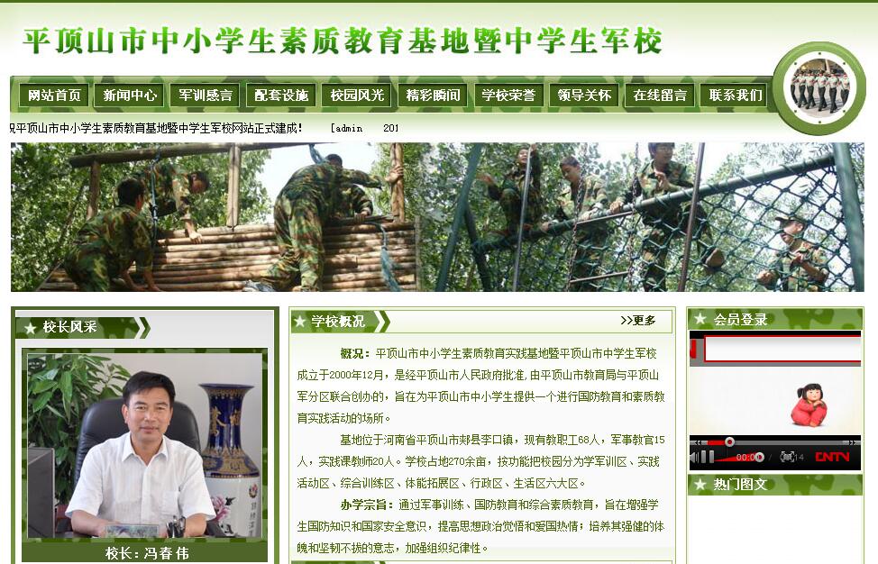平頂山市中小學生素質(zhì)教育實踐基地暨平頂山市中學生軍校成立于2000年12月,是經(jīng)平頂山市人民政府批準,由平頂山市教育局與平頂山軍分區(qū)聯(lián)合創(chuàng)辦的,旨在為平頂山市中小學生提供一個進行國防教育和素質(zhì)教育實踐活動的場所?;匚挥诤幽鲜∑巾斏绞朽P縣李口鎮(zhèn),現(xiàn)有教職工68人,軍事教官15人,實踐課教師20人。學校占地270余畝,按功能把校園分為學軍訓區(qū)、實踐活動區(qū)、綜合訓練區(qū)、體能拓展區(qū)、行政區(qū)、生活區(qū)六大區(qū)。辦學宗旨:通過軍事訓練、國防教育和綜合素質(zhì)教育,旨在增強學生國防知識和國家安全意識,提高思想政治覺悟和愛國熱情;培養(yǎng)其強健的體魄和堅韌不拔的意志,加強組織紀律性。辦學模式:由平頂山市教育局與平頂山軍分區(qū)聯(lián)合辦學,共同管理。由教育局負責組織學生,軍分區(qū)負責制訂軍訓計劃,軍訓教官由軍分區(qū)協(xié)調(diào)駐平頂山各部隊輪流派出。培訓對象:根據(jù)現(xiàn)有的規(guī)模,軍校主要接收兩部分學生,一是平頂山市城區(qū)高中一年級新生,以軍訓和國防教育為主,適當進行實踐活動;二是市城區(qū)八年級學生,以素質(zhì)教育實踐活動為主,適當進行軍訓和國防教育。管理形式:軍校實行全日制、全封閉、軍事化管理。學生入軍校后按軍隊編制,把入訓學校編為一個訓練大隊,下設(shè)若干個訓練營,每個教學班為一個連,每十人編為一個小班。培訓計劃:每學年上、下兩個學期,分別對市城區(qū)高一和八年級學生安排輪訓,每年培訓學生一萬名。上學期:以軍訓為主。接收市城區(qū)高中一年級新生,對其進行隊列、內(nèi)務整理等軍事訓練,并輔助國防知識、軍事基本技能、軍事器械教育和社會實踐活動,每期9天。下學期:以素質(zhì)教育為主。接收市城區(qū)八年級學生,開展學工、學農(nóng)、學軍等實踐活動,每期7天?;貏?chuàng)辦以來,在各級領(lǐng)導的正確領(lǐng)導下,在平頂山軍分區(qū)、駐平各部隊及各受訓學校的積極支持和密切配合下,取得了良好的教育效果,受到了各級領(lǐng)導及社會各界的廣泛好評?;叵群蟊幻麨椤盀榱嗣魈臁珖嗌倌曜晕冶Wo教育基地”、“全國青少年道德培養(yǎng)實驗基地(2011—2013)”、“河南省少年軍警??傂J痉缎!薄ⅰ昂幽鲜∏嗌倌昕萍冀逃亍?、“河南省中小學生生產(chǎn)實踐教育基地”、“河南省國防教育基地”、“國家級國防教育示范基地”;被中宣部、教育部、共青團中央等十部委授予“中國青少年社會教育‘銀杏獎’優(yōu)秀團隊獎”;軍校還先后榮獲“全國中小學思想道德建設(shè)活動先進單位”、“河南省文明單位”、“河南省文明學?!薄ⅰ昂幽鲜≈袑W生人民防空教育先進學?!?、“河南省全民國防教育先進單位”、 “平頂山市第六屆關(guān)心支持國防建設(shè)十佳單位”等榮譽稱號。