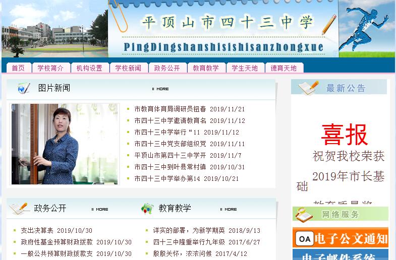 平頂山市第四十三中學(xué),1957年建校,時稱建安學(xué)校,后改名為平煤集團公司第三中學(xué),2005年企業(yè)學(xué)校劃轉(zhuǎn)后經(jīng)市政府批準(zhǔn)正式命名為平頂山市第四十三中學(xué)。學(xué)校坐落在市區(qū)礦工路西段,占地面積17.2畝,現(xiàn)有24個教學(xué)班,在校生1400余人,教職員工120人,該校擁有特級教師1人,高級教師43人,9名省級骨干教師,省市級優(yōu)質(zhì)課教師30余人。省教育廳學(xué)術(shù)技術(shù)帶頭人2名,市政府命名學(xué)術(shù)技術(shù)帶頭人1人,市級拔尖人才2人。師資力量雄厚,教學(xué)水平精湛。曾獲得“河南省首批示范性初中”、“市級文明單位”、“省級綠色學(xué)校”、“市級園林單位”、“市級衛(wèi)生單位”、“ 全國傳統(tǒng)體育項目先進學(xué)?!?、“全國群眾體育活動先進單位”、“國家級體育俱樂部”等榮譽稱號。在“以人為本,關(guān)注成長”科學(xué)理念的引領(lǐng)下,注重教師的發(fā)展、學(xué)生的發(fā)展和學(xué)校的發(fā)展,以“構(gòu)建陽光校園,爭當(dāng)陽光教師,培育陽光學(xué)生”為辦學(xué)目標(biāo)。管理突出“育人”理念;在教學(xué)中,堅持務(wù)與創(chuàng)新相結(jié)合,堅持推行素質(zhì)教育,堅定課堂教學(xué)改革創(chuàng)新的信心,抓緊教師隊伍的建設(shè),提高教師教育能力和水平,努力使學(xué)校穩(wěn)居全市教育教學(xué)質(zhì)量前茅;在工作中,要把勤奮工作以細(xì)致工作結(jié)合,嚴(yán)格要求與關(guān)心愛護學(xué)生結(jié)合,主動工作與創(chuàng)新相結(jié)合,踏實工作與團結(jié)協(xié)作結(jié)合,規(guī)范管理,理順關(guān)系,以創(chuàng)省級文明單位為目標(biāo),強化崗位責(zé)任,創(chuàng)建和諧家園,著力推動各項工作再上新臺階,為學(xué)校成為平頂山市名校奠定良好基礎(chǔ)。