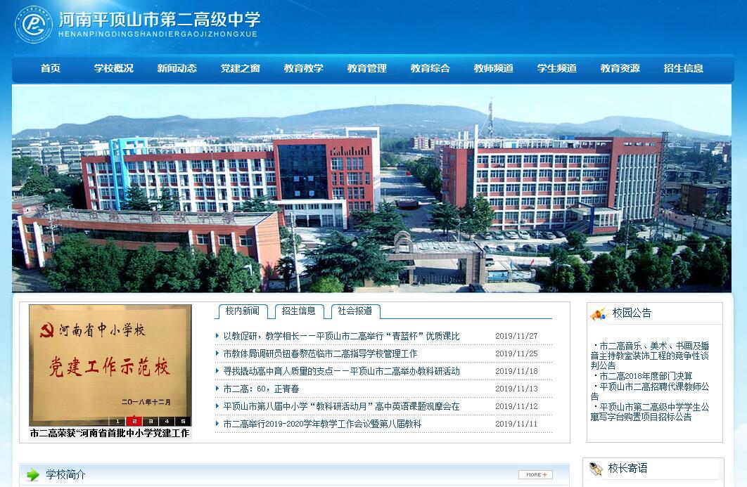 平頂山市第二高級中學(xué),是市教育局直屬的示范性普通高中。始建于1959年,原名為平頂山礦務(wù)局七礦職工子弟學(xué)校。1979年更名為平頂山礦務(wù)局第七中學(xué),1996年更名為平煤集團(tuán)第二高級中學(xué)(簡稱平煤二高)。2005年8月移交市教育局,正式更名為平頂山市第二高級中學(xué)。學(xué)校位于平安大道與礦工路西段交匯處,占地約35000平方米,現(xiàn)有30個教學(xué)班,學(xué)生1800余名。建校50多年來,市二高形成了鮮明的辦學(xué)特色,創(chuàng)造了享譽(yù)百里礦區(qū)的辦學(xué)質(zhì)量,培養(yǎng)了數(shù)萬名優(yōu)秀畢業(yè)生。特別是移交市政府管理后,學(xué)校迎來了廣闊的發(fā)展機(jī)遇。特別是移交市政府管理后,學(xué)校迎來了廣闊的發(fā)展機(jī)遇。2006年,學(xué)校被評為市級示范性高中。2012年12月,被省委、省政府聯(lián)合下文正式命名為“省級文明單位”。近年來,學(xué)校上下一心,以“兩個狠抓保質(zhì)量提升、三項(xiàng)工程促學(xué)校發(fā)展”為工作目標(biāo),不斷開拓創(chuàng)新,取得了矚目的成績,學(xué)校先后榮獲“普通高中教學(xué)質(zhì)量先進(jìn)單位”“基礎(chǔ)教育先進(jìn)集體”“普通高中特色辦學(xué)先進(jìn)學(xué)?!薄拔拿鳂?biāo)兵學(xué)?!钡葮s譽(yù)稱號。 目前,市二高以鮮明的辦學(xué)風(fēng)格,先進(jìn)的教育理念,優(yōu)良的學(xué)風(fēng)校風(fēng),濃厚的校園文化氛圍在鷹城教育界獨(dú)樹一幟。學(xué)校背靠蒼翠欲滴的落鳧山,校園建筑肅穆典雅,教學(xué)區(qū)、活動區(qū)、生活區(qū)錯落有致,布局合理,區(qū)域間蒼松翠柏,繁華碧草,綠草茵茵。校園內(nèi)環(huán)境幽靜,文化氛圍濃厚,隨處可見名句警言,充滿著濃郁的現(xiàn)代文化氣息和厚重的育人弘學(xué)底蘊(yùn),為學(xué)生提供了良好舒適的學(xué)習(xí)環(huán)境。教學(xué)設(shè)施齊全,先后建有先進(jìn)的學(xué)生微機(jī)室、多媒體教室、美術(shù)室、音樂室、舞蹈室等多功能特長專用教室,裝備了先進(jìn)的校園多媒體系統(tǒng)、閉路電視系統(tǒng)、廣播聽力系統(tǒng)、地面衛(wèi)星接收系統(tǒng),更新裝備了高標(biāo)準(zhǔn)實(shí)驗(yàn)室、圖書館,建有高標(biāo)準(zhǔn)的學(xué)生公寓樓、標(biāo)準(zhǔn)化的學(xué)生運(yùn)動場、寬敞潔凈的學(xué)生餐廳,潔凈環(huán)保的太陽能茶爐,是莘莘學(xué)子求學(xué)成長的好去處。50多年的歷史積淀,使學(xué)校擁有了一大批經(jīng)驗(yàn)豐富、學(xué)識淵博、師德高尚、理念超前、素質(zhì)優(yōu)良的教師隊(duì)伍。學(xué)?,F(xiàn)有教職工148名,其中特級教師1人,國家級骨干教師2人,河南省學(xué)術(shù)技術(shù)帶頭人5人,市級骨干教師13人,高級教師44人,市級以上優(yōu)秀輔導(dǎo)教師68人?,F(xiàn)任教師中一半以上有研究生教育經(jīng)歷,他們育人理念先進(jìn),科研創(chuàng)新能力強(qiáng),學(xué)校每學(xué)期都要開展“十大魅力教師”“十大課改標(biāo)兵”“我心目中的好老師”評選活動,為學(xué)生提供優(yōu)質(zhì)的教學(xué)保障。學(xué)校長期堅(jiān)持以“質(zhì)量立校”“科研興?!薄疤厣珡?qiáng)校”的辦學(xué)思路,連續(xù)十年被評為“平頂山市特長教育先進(jìn)學(xué)?!保啻潍@得“平頂山市高中教學(xué)質(zhì)量先進(jìn)學(xué)?!?。是河南省“學(xué)校心理研究會常務(wù)理事單位”、教育部命名的“教育科研示范單位”、全國“學(xué)習(xí)策略研究試驗(yàn)基地?!薄ⅰ叭珖逃茖W(xué)規(guī)劃普通高級中學(xué)特色學(xué)校研究專項(xiàng)課題項(xiàng)目?!?。2015年高考,我校再獲豐收。本科上線214人,本科上線率達(dá)44.4%,比2014年本科上線166人凈增48人,增長9.2個百分點(diǎn);比2013年本科上線87人凈增127人,三年連上三個大臺階,贏得了社會各界的高度贊譽(yù)。在平頂山市人民政府組織召開的慶祝第31個教師節(jié)表彰大會上,平頂山市二高榮獲“高考目標(biāo)完成獎”“優(yōu)勝學(xué)科獎”“特色教育獎”三個獎項(xiàng),被平頂山市人民政府授予“2015年高考質(zhì)量獎”獎牌,是全市所有高中唯一一所連續(xù)兩年同時獲得“高考質(zhì)量” 獎和“特色學(xué)校”獎兩個獎項(xiàng)的學(xué)校。我校是開展特長教育最早成就最突出的普通高中,在鷹城教育中獨(dú)樹一幟。是首屆河南省“青少年科技教育示范學(xué)校”、鄭州大學(xué)體育學(xué)院的“生源基地”、河南省模特藝術(shù)協(xié)會平頂山“特設(shè)基地”。與北京“星城”藝術(shù)培訓(xùn)中心聯(lián)合辦學(xué),與中央音樂學(xué)院、中國美院、河南師范大學(xué)等省內(nèi)外著名高校建有長期協(xié)作關(guān)系。多年來,特長專業(yè)過關(guān)率在全市普通高中名列前茅,使一大批學(xué)生進(jìn)入中央美院、中國傳媒學(xué)院、中國音樂學(xué)院、成都體育學(xué)院等知名高校深造。兩年來,有近50名同學(xué)被重點(diǎn)高校錄取,每屆高考本科進(jìn)線率均在95%以上。一大批中考成績不理想的學(xué)生因特長獲得升入重點(diǎn)大學(xué)深造的機(jī)會。學(xué)校注重科技創(chuàng)新教育,是首屆河南省“青少年科技教育示范學(xué)?!保劳锌萍紕?chuàng)新社團(tuán)、科技創(chuàng)新興趣小組,開設(shè)科技創(ch