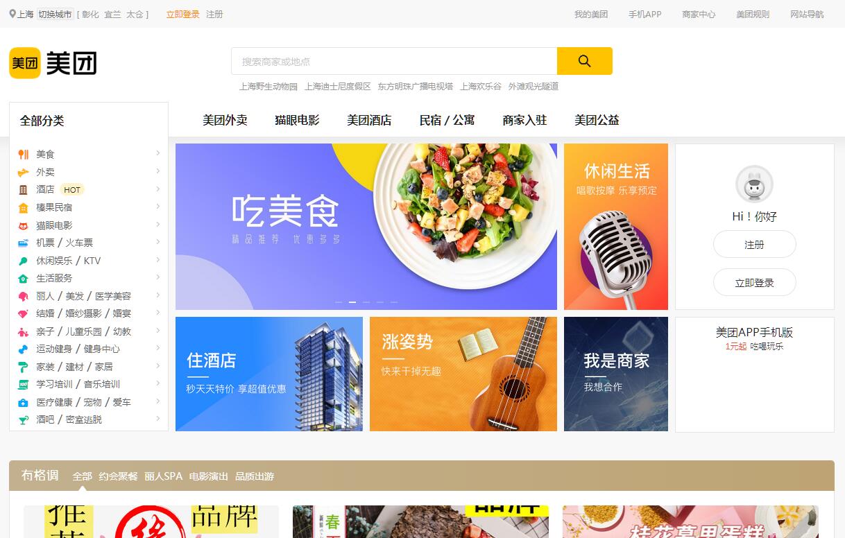 | 網(wǎng)站簡介: 美團網(wǎng):美團一次 美一次,為消費者發(fā)現(xiàn)值得信賴的商家,讓消費者享受超低折扣的優(yōu)質(zhì)服務(wù)。每天多單團購,為商家找到合適的消費者,給商家提供優(yōu)質(zhì)的互聯(lián)網(wǎng)技術(shù)服務(wù)。美團網(wǎng)精選美食餐廳,酒店預(yù)訂,電影票,旅游景點,外賣訂餐,團購信息,您可查詢商家評價店鋪信息。上海生活,下載美團官方APP ,吃喝玩樂1折起。 |