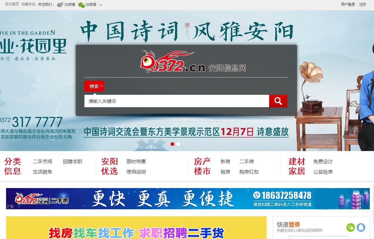 安陽信息網(wǎng)(0372.CN)由安陽市政府信息中心主辦,河南樂蟻傳媒有限公司投資運(yùn)營,注冊資金110萬元,現(xiàn)有員工50余人,辦公面積近千平米。網(wǎng)站開通于2007年,是安陽較大的社區(qū)化門戶網(wǎng)站和較具影響力的互聯(lián)網(wǎng)媒體,也是河南省較大的商業(yè)化城市綜合網(wǎng)站。網(wǎng)站于2009年入選河南省首批25家省級重點(diǎn)網(wǎng)站。網(wǎng)站開通論壇、黃頁、房產(chǎn)、人才、汽車、建材等欄目,主要產(chǎn)品和服務(wù)有網(wǎng)絡(luò)廣告、微信推廣等,同時(shí)還組織車友會、戶外、騎友、漁友等社會團(tuán)體,豐富網(wǎng)民業(yè)余生活。安陽信息網(wǎng)立足安陽本地,專注城市消費(fèi)群體,貼近生活,強(qiáng)化互動(dòng)性,鼓勵(lì)會員積極分享,致力于為用戶提供豐富實(shí)用、涵蓋廣泛的本地信息,良好用戶體驗(yàn)的網(wǎng)站平臺和精彩紛呈線上線下活動(dòng),滿足市民在生活、商務(wù)領(lǐng)域?qū)ヂ?lián)網(wǎng)的信息、娛樂、應(yīng)用等各種需求。