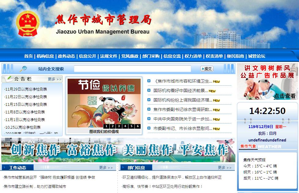 焦作市城市管理局為焦作市住房和城鄉(xiāng)建設(shè)局管理的主管全市城市管理工作的部門管理機構(gòu)。其主要職責是:(一)貫徹執(zhí)行國家、省有關(guān)城市管理方面的法律、法規(guī)和方針、政策;擬訂全市城市管理方面的規(guī)范性文件和發(fā)展規(guī)劃、年度計劃;參與制定涉及城市管理方面的總體規(guī)劃。(二)負責協(xié)調(diào)、監(jiān)督、檢查城市管理工作,行使城市管理方面的法律、法規(guī)、規(guī)章規(guī)定的行政處罰權(quán)。(三)負責對城管監(jiān)察隊伍的執(zhí)法監(jiān)督,會同有關(guān)部門查處城市管理中的重大違法、違紀案件。(四)負責城區(qū)市管市政設(shè)施的行政執(zhí)法;負責城市市政設(shè)施有關(guān)規(guī)費的征繳。(五)負責對城市市政設(shè)施的巡查監(jiān)管,并將巡查發(fā)現(xiàn)的問題按有關(guān)程序辦理。(六)負責城區(qū)戶外廣告的設(shè)置和管理,查處違章戶外廣告;負責對城市建筑物、道路、沿街標志等容貌的監(jiān)管。(七)負責城區(qū)環(huán)境衛(wèi)生、車輛清洗等行業(yè)管理;擬訂環(huán)衛(wèi)發(fā)展長遠規(guī)劃、年度計劃和環(huán)衛(wèi)作業(yè)標準;負責對環(huán)衛(wèi)管理和作業(yè)實施指導、檢查、考核;負責城市公廁、垃圾中轉(zhuǎn)站、果皮箱等環(huán)衛(wèi)設(shè)施規(guī)劃、設(shè)計、施工和管理;負責城區(qū)垃圾、渣土管理和終端處理;負責市直黨政機關(guān)、事業(yè)單位、城區(qū)機動車輛和國家、省、市大中型企業(yè)的生活垃圾處理費征收;負責城區(qū)主干道清掃保潔機械化作業(yè),并對城區(qū)生活垃圾管理實施監(jiān)督;負責城區(qū)星級旅游公廁的管理。(八)擬訂全市城市夜景照明的規(guī)劃設(shè)計并組織實施。(九)指導縣(市)區(qū)城市管理工作。(十)承辦法律、法規(guī)、規(guī)章規(guī)定的行政許可、審批、審核、核準等事項。(十一)承辦市政府、市住房和城鄉(xiāng)建設(shè)局交辦的其他事項。