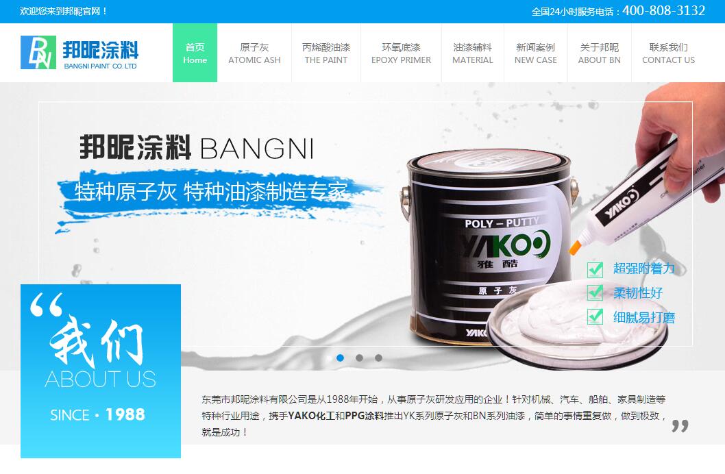 | 網(wǎng)站簡介: 東莞市邦昵涂料有限公司1988年開始從事原子灰行業(yè),東莞市邦昵涂料有限公司創(chuàng)立于2000年(客戶在使用過程中遇到的所有問題,我們都會有能力幫助客戶解決),主要銷售原子灰與油漆產(chǎn)品。原子灰產(chǎn)品包含普通型﹑高級型﹑高溫型﹑鋁合金型﹑高溫粉沫型﹑風力發(fā)電玻璃鋼風葉PU專用型﹑噴槍噴涂型原子灰﹑節(jié)能輕質(zhì)環(huán)氧型原子灰等多種類型(特別:風力發(fā)電玻璃鋼風葉PU專用原子灰達到世界水平),可滿足多種行業(yè)需求。油漆產(chǎn)品主要有:汽車修補漆﹑汽車原廠漆﹑3G工業(yè)漆﹑高檔鋁合金門窗漆﹑豪華游艇表面漆﹑超豪華游艇內(nèi)裝PU漆(現(xiàn)有多家豪華玻璃鋼游艇公司及多家高檔鋁合金門窗指定使用產(chǎn)品)。 |