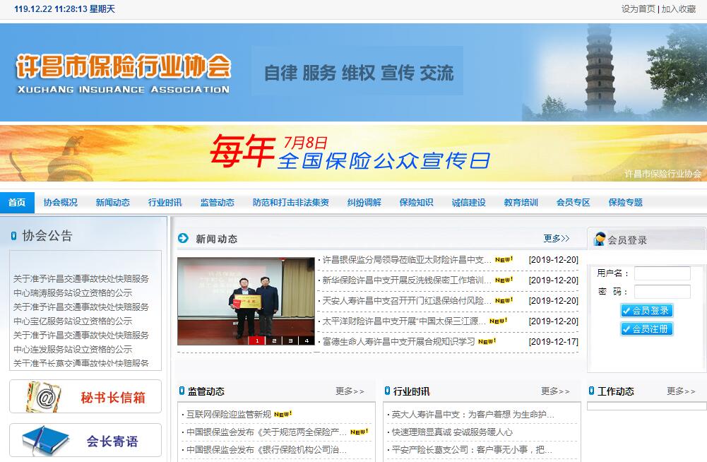 許昌市保險(xiǎn)行業(yè)協(xié)會(huì)成立于2010年11月11日,是許昌市民政局批準(zhǔn)的保險(xiǎn)業(yè)自律性社團(tuán)組織。中國(guó)銀行保險(xiǎn)監(jiān)督管理委員會(huì)河南監(jiān)管局依法對(duì)許昌市保險(xiǎn)行業(yè)協(xié)會(huì)進(jìn)行管理、指導(dǎo)和監(jiān)督。協(xié)會(huì)的工作宗旨是:遵守憲法、法律、法規(guī)和經(jīng)濟(jì)金融方針政策,遵守社會(huì)道德風(fēng)尚,督促會(huì)員自律,維護(hù)行業(yè)利益,促進(jìn)行業(yè)發(fā)展,為會(huì)員提供服務(wù),促進(jìn)市場(chǎng)公開、公平、公正。工作核心是自律和服務(wù),基本職責(zé)為:自律、維權(quán)、協(xié)調(diào)、交流、宣傳。協(xié)會(huì)現(xiàn)有會(huì)員49家(截至2019年2月),其中產(chǎn)險(xiǎn)公司24家,壽險(xiǎn)公司25家。