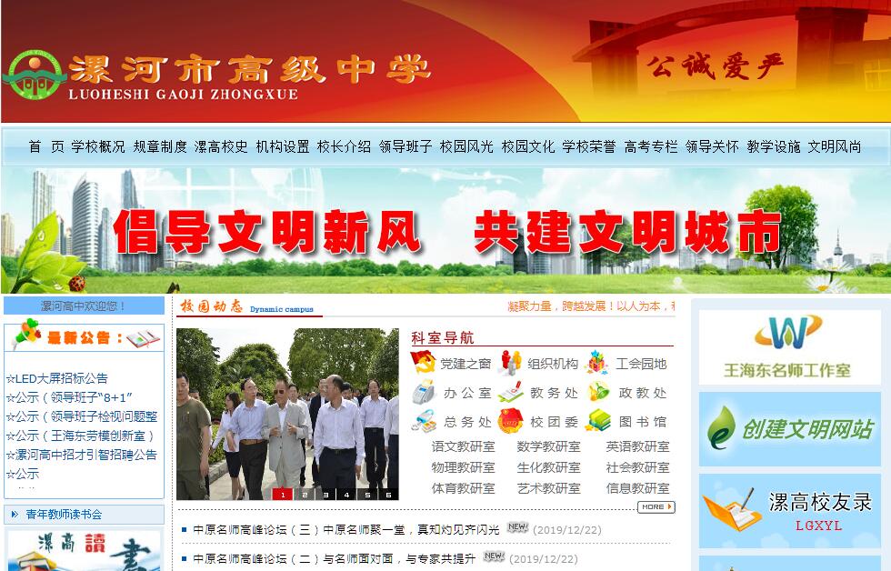 漯河高中創(chuàng)建于1948年,是河南省首批示范性高中,學(xué)??偯娣e533畝(含新校區(qū))。經(jīng)過60余年的發(fā)展,學(xué)校已成為一所教風(fēng)嚴(yán)謹(jǐn)、學(xué)風(fēng)純正、辦學(xué)理念科學(xué)、校園環(huán)境優(yōu)美、教學(xué)設(shè)施先進(jìn)、教師水平一流、高考成績輝煌、周邊縣市莘莘學(xué)子夢寐以求的成才殿堂。漯河高中現(xiàn)有在校生6500余人,教職工320人,專職教師全部為大學(xué)本科以上學(xué)歷。其中特級教師3人,國家級名師1人,中原名師1人,國家級骨干教師2人,教育部公派留英學(xué)者4人,省教育教學(xué)專家1人,省教師教育專家2人,省級學(xué)科帶頭人6人,省級骨干教師7人,高級教師121人,擁有研究生學(xué)歷者達(dá)86人,市級優(yōu)秀班主任76人,市級優(yōu)秀教師112人。漯河高中擁有標(biāo)準(zhǔn)化理化生實(shí)驗(yàn)室、標(biāo)準(zhǔn)化運(yùn)動(dòng)場和體育館,圖書館藏書12萬余冊,有學(xué)生宿舍樓9棟,設(shè)2人、4人、6人間。南北校區(qū)各擁有一棟河南省AAA級學(xué)生餐廳。新校區(qū)教室內(nèi)裝有空調(diào)。漯河高中先進(jìn)完善的教育教學(xué)設(shè)施為學(xué)生成才創(chuàng)造了優(yōu)良的條件。在市教育局組織的歷次統(tǒng)考中,漯河高中均以壟斷優(yōu)勢位居全市第一。高考成績連續(xù)十四年奪得全市高考前三名占有率、應(yīng)屆生上線率、重點(diǎn)大學(xué)上線率、萬人上線率、凈增長率等年年全市第一名。2014年高考齊華瑞同學(xué)勇奪省文科狀元。漯河高中素質(zhì)教育碩果累累,學(xué)生創(chuàng)造力和奧賽成績?nèi)“渭?。僅2004年至今,數(shù)學(xué)、物理、化學(xué)、生物等學(xué)科就有98人(次)獲得省級、國家級奧賽獎(jiǎng)。05屆學(xué)生王杰瑞和06屆學(xué)生韓蕭開發(fā)的“電臺數(shù)字音頻工作站”軟件獲得第19屆河南省青少年科技創(chuàng)新大賽一等獎(jiǎng),開漯河先河!07級畢業(yè)生郭榕同學(xué)獲得省化學(xué)競賽一等獎(jiǎng),被保送進(jìn)入復(fù)旦大學(xué)學(xué)習(xí)。一流的英語教學(xué)是漯河高中的一大特色:05屆學(xué)生張棟同學(xué)英語口語“比美國人還純正”(“瘋狂英語”創(chuàng)始人李陽語),2004年8月取得647分的托福考試成績,并以其優(yōu)秀的綜合素質(zhì)于2005年4月15日被美國蒙特·豪里尤克女子大學(xué)錄取,獲得全額獎(jiǎng)學(xué)金,已哈佛讀研究生畢業(yè)。2008-2010年在河南省中學(xué)生英語綜合技能競賽中,漯河高中連續(xù)9人次獲高中組一等獎(jiǎng)。六十三年的探索和追求,漯河高中英才輩出,群星璀璨。從漯高走出過原中央政治局委員、中央軍委副主席、國務(wù)委員兼國防部長曹剛川上將,中央委員、總后勤部副部長秦銀河將軍,中國礦業(yè)大學(xué)常務(wù)副校長、長江學(xué)者趙躍民教授,雙匯集團(tuán)董事長萬隆等黨政軍領(lǐng)導(dǎo)人和商業(yè)精英。僅90年代以來,漯河高中歷屆畢業(yè)生中,獲得博士學(xué)位的就達(dá)388人,公派出國學(xué)者達(dá)198人之多。近五年僅考入清華、北大、復(fù)旦等名校的就高達(dá)346人。漯河高中辦學(xué)成績卓著,備受社會關(guān)注,中科大、吉林大學(xué)、南京理工、西北工大、中國礦業(yè)大學(xué)、鄭州大學(xué)、解放軍外國語學(xué)院等全國重點(diǎn)院校都把漯河高中設(shè)立為生源基地。由于辦學(xué)成績突出,引領(lǐng)教育方向,漯河高中多次獲得國家、部、省級表彰,近幾年學(xué)校先后被評為全國師德建設(shè)先進(jìn)單位,全國信息化建設(shè)先進(jìn)單位,全國校園文化建設(shè)先進(jìn)單位,全國教育科學(xué)規(guī)劃教育部優(yōu)秀科研基地,全國五四紅旗團(tuán)委,河南省首批示范性高中,河南省衛(wèi)生先進(jìn)單位,河南省化學(xué)教學(xué)科研基地學(xué)校,河南省依法治校先進(jìn)單位,2007年被人事部、教育部評為教育系統(tǒng)先進(jìn)集體。