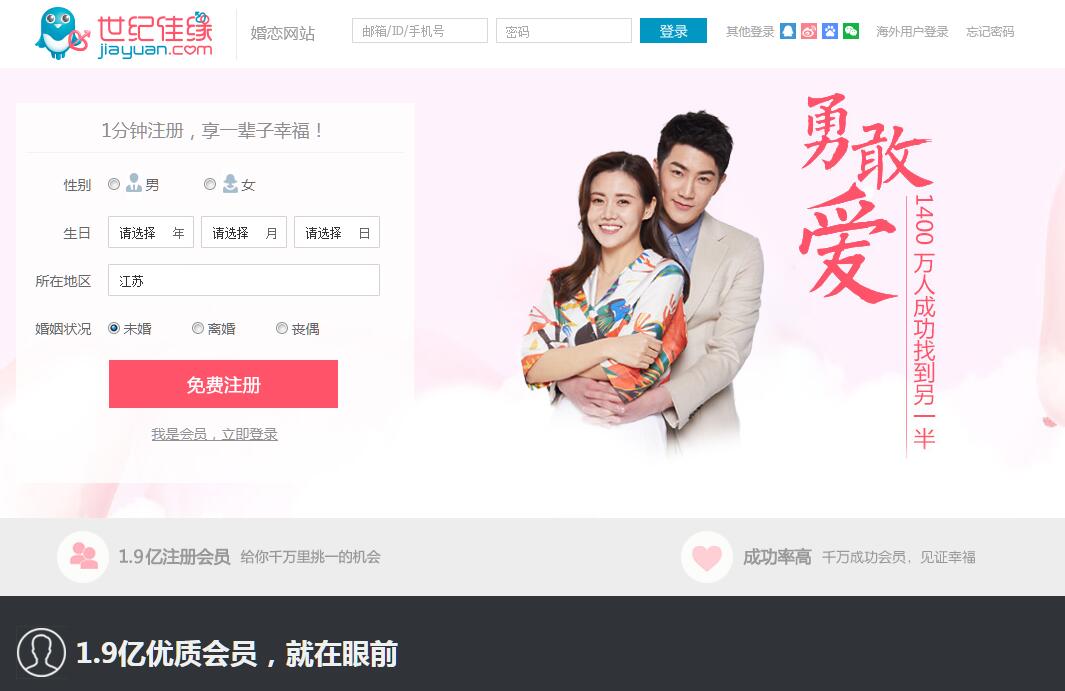世紀佳緣,中國領先的婚戀交友平臺,2003年10月8日創(chuàng)立于中國上海。自創(chuàng)立以來,世紀佳緣致力為用戶提供全方位的在線婚戀交友服務。2007年開始探索針對用戶端收費模式,2008年實現(xiàn)盈利。2011年5月11日,世紀佳緣登陸美國納斯達克股票市場,成為國內(nèi)首家上市的在線婚戀交友平臺。世紀佳緣持續(xù)穩(wěn)居行業(yè)翹楚地位,占據(jù)互聯(lián)網(wǎng)婚戀交友76%的用戶瀏覽時間份額,互聯(lián)網(wǎng)婚戀市場份額占據(jù)26.7%。截至2016年7月,世紀佳緣用戶注冊總數(shù)超1.7億。世紀佳緣自2013年起大力推進公司主營業(yè)務從PC端向移動端轉移,并在移動端進行多品牌的戰(zhàn)略布局,相繼推出求愛網(wǎng)、求約會等移動端產(chǎn)品,2014年更是加速布局移動端,5月推出愛真心App后,世紀佳緣新版App也在當年12月正式上線。2016-2017年佳緣移動端陸續(xù)推出么么答、佳緣直播等產(chǎn)品,給予用戶更好的互動體驗。世紀佳緣移動客戶端長期在APP Store社交類暢銷排行先鋒,月活躍用戶高達500多萬,在行業(yè)中保持領先地位。覆蓋PC和移動端的同時,世紀佳緣一對一紅娘業(yè)務也保持著穩(wěn)步提升。截至2017年4月,一對一紅娘業(yè)務已經(jīng)覆蓋全國71個主要城市107家線下實體店,除一對一紅娘業(yè)務外,世紀佳緣還于2015年7月推出紅娘經(jīng)紀人業(yè)務,截至2017年4月,紅娘經(jīng)紀人人數(shù)已超過15000人。紅娘經(jīng)紀人業(yè)務是全球分享經(jīng)濟大潮中的創(chuàng)新一員,作為中國互聯(lián)網(wǎng)婚戀交友行業(yè)的先驅和優(yōu)秀代表,世紀佳緣CEO吳琳光受邀參加2015年烏鎮(zhèn)世界互聯(lián)網(wǎng)大會時表示:“國家近兩年提倡的‘互聯(lián)網(wǎng)+’是全球互聯(lián)網(wǎng)共同的趨勢,特別是分享經(jīng)濟更是未來的發(fā)展潮流,世紀佳緣會繼續(xù)堅持創(chuàng)新,擁抱創(chuàng)新,不斷開拓新業(yè)務,服務好用戶?!薄凹s會吧”是世紀佳緣繼紅娘一對一之后,對線下業(yè)務的又一次拓展和創(chuàng)新。傳統(tǒng)相親模式過于形式化,相親效率較低,世紀佳緣“約會吧”相比于傳統(tǒng)相親模式更為自由靈活,也更加高效。首先提高了安全性,在“約會吧”所有會員都必須出示身份證進行實名登記,并簽署單身承諾保證書,相親地點是在“約會吧”里面,更好的提高相親對象的安全保障;2015年9月世紀佳緣還創(chuàng)新性地推出佳緣金融服務,利用龐大的用戶規(guī)模,深度挖掘“婚戀+金融”的婚戀場景金融服務,深受用戶好評。增加了用戶粘性以及付費服務性價比,最大程度的吸引和留存住用戶,實現(xiàn)多方共贏。截止到2016年9月,佳緣金融加入中國互聯(lián)網(wǎng)金融協(xié)會。截止至2016年12月30日,佳緣金融累積投資金額超過18億元人民幣。世紀佳緣近年來一直大力倡導大數(shù)據(jù)相親,先后研發(fā)人臉識別、懂你系統(tǒng)等智能匹配系統(tǒng),并將線上線下業(yè)務成功結合,每年在中國大陸地區(qū)的168個城市舉辦超過1000場線下活動,曾成功舉辦中國首屆愛情運動會,多場萬人相親大會和集體婚禮。世紀佳緣自成立以來一直深受國內(nèi)外媒體和政府相關部門的關注和支持。艾瑞咨詢和易觀國際等第三方機構發(fā)布的報告顯示,世紀佳緣網(wǎng)站多年來一直在市場占有率、用戶注冊量、用戶黏性、用戶活躍度和用戶瀏覽時長等指標上遙遙領先,并多次榮獲世界互聯(lián)網(wǎng)流量500強、中國互聯(lián)網(wǎng)企業(yè)100強,中國品牌媒體百強,年度最佳創(chuàng)新獎、年度品牌企業(yè)獎、IAI國際廣告-病毒營銷優(yōu)秀獎、易觀之星等多項榮譽。世紀佳緣交友網(wǎng):致力于打造國內(nèi)領先的在線婚戀交友平臺,數(shù)百萬會員在這里找到對象?,F(xiàn)1.7億注冊會員,讓緣分千萬里挑一!