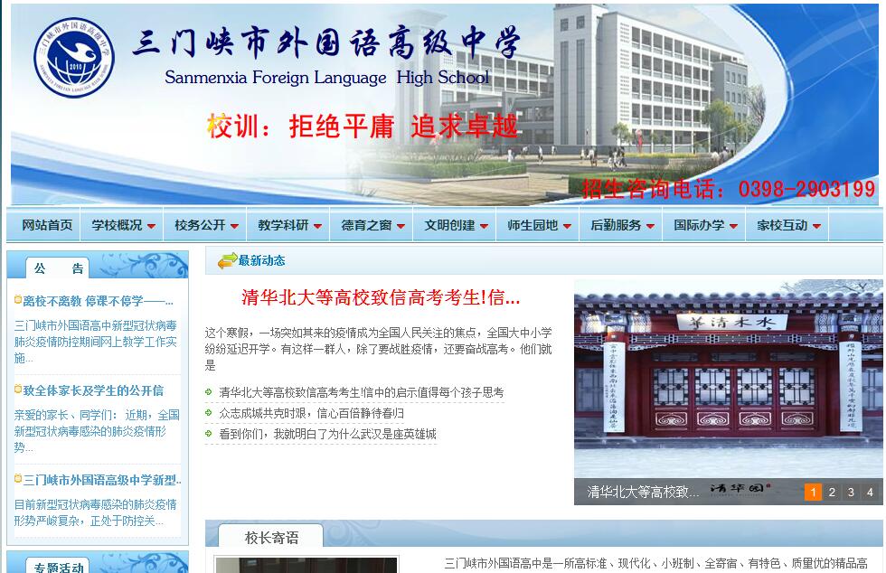 三門峽市外國(guó)語(yǔ)高中創(chuàng)建于2010年。學(xué)校位于三門峽市經(jīng)濟(jì)開發(fā)區(qū)北環(huán)路以西,陜州風(fēng)景區(qū)東北側(cè),北依黃河,總占地面積180.54畝,規(guī)劃建設(shè)用地169.14畝,建筑面積9.2萬(wàn)平方米,設(shè)計(jì)規(guī)模為4500人,90個(gè)教學(xué)班。學(xué)?,F(xiàn)有教職工222人,均具有大學(xué)本科以上學(xué)歷,學(xué)歷達(dá)標(biāo)率100%。其中研究生學(xué)歷50人,高級(jí)教師47人,獲得省級(jí)學(xué)科大獎(jiǎng)的38人,三名海外留學(xué)生,兩名外籍教師。學(xué)校硬件設(shè)施均按照“人本、超前、實(shí)用、一流”的原則配備。目前,學(xué)校擁有物理實(shí)驗(yàn)室4個(gè)、化學(xué)實(shí)驗(yàn)室4個(gè)、生物實(shí)驗(yàn)室2個(gè)、微機(jī)室2個(gè),通用技術(shù)實(shí)驗(yàn)室2個(gè)。圖書室、閱覽室2個(gè),藏書五萬(wàn)余冊(cè)。學(xué)生公寓每室均配備空調(diào)、壁柜、飲水機(jī)、獨(dú)立衛(wèi)生間,冬季集中供暖,全天供應(yīng)熱水。四個(gè)餐廳可容5000余人同時(shí)就餐。室內(nèi)體育館面積3000平米,室外體育場(chǎng)設(shè)有400米的塑膠跑道、天然草坪足球場(chǎng)、8個(gè)標(biāo)準(zhǔn)塑膠籃球場(chǎng)和4個(gè)標(biāo)準(zhǔn)塑膠排球場(chǎng),均通過“亞洲田徑聯(lián)賽”認(rèn)證。學(xué)校教育特色鮮明。教學(xué)方面主要體現(xiàn)在外語(yǔ)教學(xué)突出、注重校本課程的開發(fā)與教學(xué)、體音美實(shí)行分項(xiàng)教學(xué)等。管理方面實(shí)行小紅帽、小橘帽學(xué)生自治管理,輔以導(dǎo)師制全程陪伴成長(zhǎng)。鼓勵(lì)學(xué)生積極組織各種有益活動(dòng),現(xiàn)在學(xué)校已有學(xué)生自發(fā)組織的綠橄欖外語(yǔ)社、萱瑞堂文學(xué)社、x-power街舞社、雷雨話劇社等13個(gè)社團(tuán)。學(xué)校秉承“拒絕平庸,追求卓越”的校訓(xùn),本著“人本、高效、和諧、幸?!钡睦砟睿l(fā)揚(yáng)“厚德、博學(xué)、協(xié)作、超越”的教風(fēng),光大“勤學(xué)、樂學(xué)、善學(xué)、篤學(xué)”的學(xué)風(fēng),自強(qiáng)不息,勵(lì)志篤行。辦學(xué)之初便在全市各種考核中脫穎而出,2010年至今,先后獲得“河南省校本教研示范?!薄叭T峽市示范性高中”“目標(biāo)完成優(yōu)秀單位”“三門峽市文明單位”“三門峽市綠色學(xué)校”“三門峽市園林單位”“三門峽市社會(huì)綜合治理先進(jìn)單位”等。