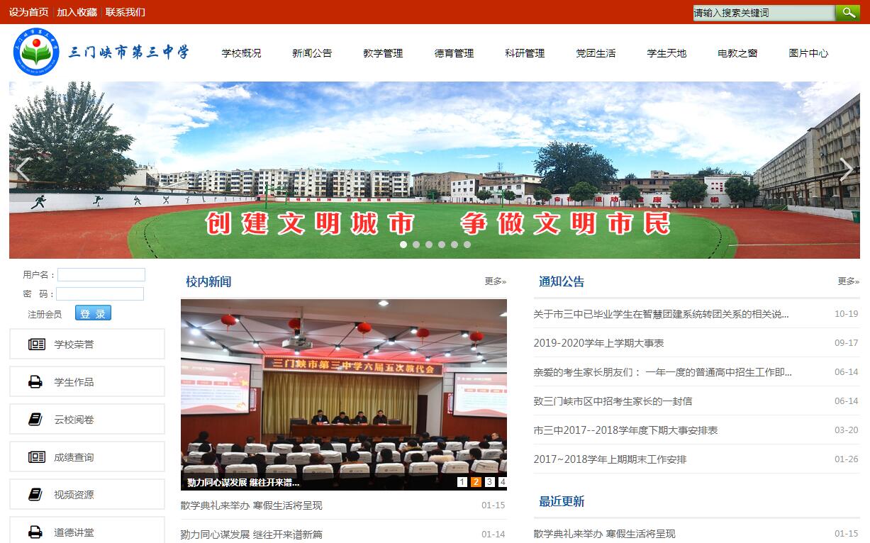 三門峽市第三中學位于市區(qū)黃河路與經(jīng)一路交匯的黃金地帶,是三門峽市教育局直屬中學。學?,F(xiàn)有34個教學班,2200余名學生,是一所建校40余年的老校、名校。經(jīng)過幾代領導集體的勵精圖治和全體教職員工的奮勇拼搏,如今她已成為一所具有悠久的治校傳統(tǒng)、燦爛的校園文化、領先的教學設施、科學的管理機制、集眾多名師和一流辦學質(zhì)量的現(xiàn)代化學校。幾十年來為高一級學校輸送了數(shù)以萬計的優(yōu)秀人才。作為三門峽示范性學校,學校曾先后榮獲全國教育實踐先進學校、河南省職業(yè)道德建設先進單位、河南省文明學校、河南省體育衛(wèi)生先進學校、河南省德育先進校、河南省實驗教學先進校、河南省勤工儉學先進校和三門峽市教學管理先進單位、三門峽市現(xiàn)代教育技術示范校等國家、省、市60余項殊榮。學校150余名教職工中,擁有國家級骨干教師1名,省級骨干教師7名,市級骨干教師34名;高級教師47名,中級教師56名;市教育教學名師3名,學科帶頭人8名。教師隊伍實現(xiàn)了精良化目標。在教育教學管理中,學校堅持以“五項活動”為載體,注重管理創(chuàng)新,在學習洋思教學模式和杜郎口教學模式的基礎上,立足校本實際,不斷探索和實踐,最終形成了獨具三中特色的課堂教學模式,即“主體參與式六環(huán)節(jié)”教學模式,成為三門峽市首批高效課堂實驗學校。本學期,學校以教育局的“大教育觀”為指導,進一步確立了“建一流的學校、創(chuàng)一流的品牌、辦一流的教育”的中長期目標,“讓學生每天都有進步”成為辦學新理念。學校尤其進一步深化了構建高效課堂實驗工作。領導包年級、包班、包教研組,實行管理下沉;任課教師承包學生,開展“一對一”結(jié)對幫扶;采取“請進來”和“走出去”方式,組織教師學習、實踐外地校的先進課改經(jīng)驗;嚴格按照三門峽市初中高效課堂教學基本流程》或“主體參與式六環(huán)節(jié)”教學模式進行課堂教學;開展各學科、各學段“新授課、講評課、寫作課、復習課、實驗課、自習課”六種課型結(jié)構特征和教學要求的校本專題研究等,極大促進了課堂效益的提升。學校進一步細化了教學常規(guī)管理,建立健全了“集體備課、個人說課、資源共享、課后反思”集體備課制度,充分發(fā)揮教研組長、備課組長、教學名師、骨干教師和學科帶頭人的示范作用。高效課堂實驗過程,既扎扎實施,又轟轟烈烈,再次點燃了廣大教師干事創(chuàng)業(yè)的熱情。潮平兩岸闊,風正一帆懸。如今有著40年文化積淀的市三中這艘巨輪,正朝著“一高兩無三優(yōu)”人民滿意學校的目標,劈波斬浪,奮勇前行。