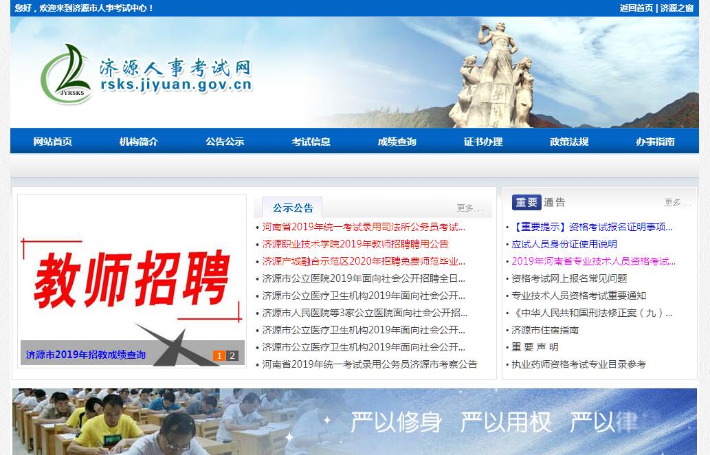 濟源人事考試網由濟源市人事考試中心主辦。濟源市人事考試中心是濟源市人力資源和社會保障局所屬的事業(yè)單位。主要承擔濟源轄區(qū)內的由國家人力資源和社會保障部、河南省人力資源和社會保障廳推行的各類職業(yè)(執(zhí)業(yè))資格考試、專業(yè)技術資格考試、公務員錄用考試以及負責本地的事業(yè)單位公開招考和其他社會化委托考試的考務工作。在河南省人事考試中心和濟源市人力資源和社會保障局的指導下,中心一直遵循“公平、公正、公開”的原則,致力于考試隊伍建設、規(guī)范考試管理,努力打造濟源人事考試和服務的精品。濟源市人事考試中心以國家政策性考試為主,以公務員錄用考試、事業(yè)單位公開招聘為輔,是政府服務社會,開展公平競爭、公開選拔人才的重要“窗口”。其主要職能有:1、承擔濟源轄區(qū)各類專業(yè)技術資格、執(zhí)業(yè)資格考試的組織實施工作;2、承擔國家人力資源和社會保障部組織的濟源地區(qū)全國職稱外語等級考試組織工作;3、承擔全國專業(yè)技術人員計算機應用水平考試的組織工作;4、承擔濟源地區(qū)國家機關公務員錄用資格考試的報名考試工作;5、承擔社會化委托考試工作,為委托單位提供系統(tǒng)內的競爭上崗、公開選拔等的命題組織、選派面試考官等。