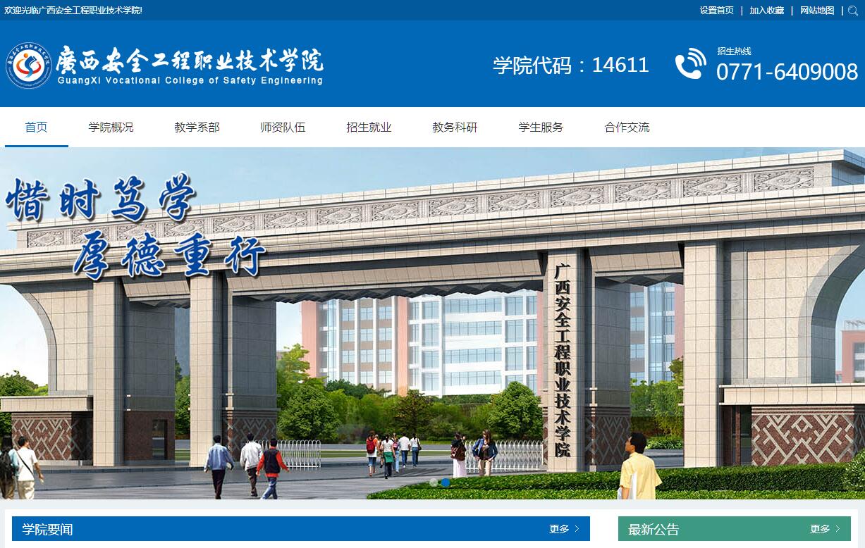 廣西安全工程職業(yè)技術(shù)學(xué)院(以下簡稱安職院)是2017年3月由廣西壯族自治區(qū)人民政府批準設(shè)立的公辦全日制普通高等院校,由自治區(qū)人民政府與國家應(yīng)急管理部(原國家安全生產(chǎn)監(jiān)督管理總局)共建,由自治區(qū)應(yīng)急管理廳(原自治區(qū)安全生產(chǎn)監(jiān)督管理局)舉辦、建設(shè)和管理,廣西壯族自治區(qū)教育廳業(yè)務(wù)指導(dǎo),是全國第三所安全類高職學(xué)院。學(xué)院地處南寧教育園區(qū),交通便利,區(qū)位優(yōu)勢明顯。學(xué)院占地面積1057畝,規(guī)劃總建筑面積28.7萬平方米,規(guī)劃總投資9.68億元。學(xué)院服務(wù)定位“立足廣西,面向全國,輻射東盟”。秉承“以服務(wù)安全生產(chǎn)、培養(yǎng)應(yīng)用人才”的辦學(xué)宗旨,明確了“把學(xué)院建設(shè)成為國內(nèi)同類高等職業(yè)院校先進的,具有區(qū)位優(yōu)勢和特色的高等職業(yè)院?!钡霓k學(xué)目標;堅持立德樹人,以培養(yǎng)適應(yīng)企業(yè)安全生產(chǎn)需要的高素質(zhì)技術(shù)技能人才為根本任務(wù)。學(xué)院堅持走省部共建、校企合作、工學(xué)結(jié)合之路,突出安全技術(shù)與管理人才的培養(yǎng)培訓(xùn),具有鮮明的辦學(xué)特色。自治區(qū)人民政府與國家應(yīng)急管理部(原國家安全生產(chǎn)監(jiān)督管理總局)簽訂了省部共建協(xié)議,在學(xué)院共建中國-東盟安全生產(chǎn)培訓(xùn)基地。學(xué)院已完成投資6.46億元,建成教舍、實訓(xùn)廠房、公寓、學(xué)生食堂、運動場、圖書館等主體功能建筑15.3萬m2;至年底預(yù)計累計完成投資7.8億元,19萬m2建筑,基本建成教學(xué)、運動、實訓(xùn)、住宿、行政等五個功能區(qū)。具備6000名在校生規(guī)模的辦學(xué)能力。2020年,學(xué)院計劃投資3億元,完成近9萬m2配套建筑,全面完成規(guī)劃建設(shè)任務(wù),具備9000名在校生辦學(xué)能力。截止目前,學(xué)院擁有教師221名,其中副高及以上職稱47人,聘請了在專業(yè)領(lǐng)域享有較高聲望的區(qū)內(nèi)外大學(xué)19名專家、教授擔任學(xué)院客座教授和學(xué)科帶頭人。學(xué)院開設(shè)有安全技術(shù)與管理、建筑工程技術(shù)(工程質(zhì)量與安全方向)、信息安全與管理、工程測量技術(shù)、機電一體化技術(shù)、會計、消防工程技術(shù)、工程造價、汽車檢測與維修技術(shù)、救援技術(shù)、電子商務(wù)、攝影測量與遙感技術(shù)、無人機應(yīng)用技術(shù)、環(huán)境監(jiān)測與控制技術(shù)等14特色專業(yè),已建成非煤礦山、礦井火災(zāi)、工程測量、財會等專業(yè)實訓(xùn)室共41個為學(xué)生實踐活動創(chuàng)造良好的條件。學(xué)院已經(jīng)與廣西建工集團、信發(fā)集團、廣西投資集團有限公司、中國建筑第八工程局、廣西交通投資集團有限公司、廣西新發(fā)展交通集團有限公司、廣西西江開發(fā)投資集團有限公司、桂林福達集團有限公司、百色百礦集團有限公司和江蘇匯博機器人技術(shù)股份有限公司等區(qū)內(nèi)外大中型企業(yè)簽訂戰(zhàn)略合作協(xié)議,搭建產(chǎn)教融合平臺,開展訂單、定向等方式培養(yǎng)人才,學(xué)生畢業(yè)有穩(wěn)定的就業(yè)渠道。2019年,為響應(yīng)國務(wù)院高職擴招100萬號召,學(xué)院多措并舉,共錄取了4601名新生,招生規(guī)模實現(xiàn)“井噴式”發(fā)展,提前完成了自治區(qū)人民政府批復(fù)的辦學(xué)規(guī)模,實現(xiàn)“雙突破”,即突破了“三年辦學(xué)在校生規(guī)模5000人”和“2019年3000人招生計劃指標”兩個目標。當前,學(xué)院教學(xué)秩序井然,教學(xué)質(zhì)量穩(wěn)步提高,學(xué)生安心學(xué)習(xí),教育事業(yè)穩(wěn)健發(fā)展。