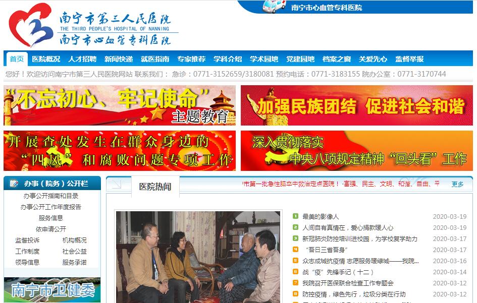 南寧市第三人民醫(yī)院創(chuàng)建于1962年7月,隸屬于南寧市衛(wèi)生健康委員會,是一所集醫(yī)療、教學、科研、預防保健、康復為一體的國家三級心血管??漆t(yī)院。是國家級愛嬰醫(yī)院;中、區(qū)直駐邕單位職工、南寧市城鎮(zhèn)職工及城鎮(zhèn)居民基本醫(yī)療保險AAA級定點醫(yī)院;廣西新農(nóng)合兒童先天性心臟病定點救治醫(yī)院;廣西紅十字天使計劃博愛救心行動定點醫(yī)院;南寧市農(nóng)村貧困人口大病專項救治工作定點醫(yī)院;南寧市第一批急性腦卒中救治定點醫(yī)院;右江民族醫(yī)學院、南寧市衛(wèi)生學校等多個中高等院校的教學醫(yī)院?,F(xiàn)有職工570余人,其中衛(wèi)生專業(yè)技術(shù)人員490余人(其中:高級職稱70余人,中級職稱160余人)。全院開放床位306張,開設有急診科、心內(nèi)科、神經(jīng)科、綜合內(nèi)科、胸心血管外科、骨科、普外消化科、婦產(chǎn)科、兒科、五官科、中醫(yī)科、重癥醫(yī)學科等17個臨床科室,其中胸心血管科(心內(nèi)科、胸心血管外科)、神經(jīng)科為南寧市醫(yī)學特色??啤P膬?nèi)科在高血壓、冠心病、心律失常、小兒先天性心臟病的介入治療方面積累了豐富經(jīng)驗。開展冠狀動脈造影檢查、冠脈成形支架植入、二尖瓣球囊成形、心臟起搏器植入及先天性心臟病室間隔缺損、房間隔缺損、動脈導管未閉封堵,心律失常射頻消融術(shù)以及外周血管介入治療等技術(shù)成熟。胸心血管外科自1987年成功開展首例心臟手術(shù)至今,已完成各類心臟手術(shù)3000多例,開展心臟瓣膜成形及置換術(shù)和改良迷宮術(shù)治療慢性心房顫動;冠狀動脈搭橋術(shù);房間隔、室間隔損缺修補術(shù);法洛氏四聯(lián)癥根治術(shù)、右心室雙出口、三尖瓣下移、三尖瓣閉鎖、肺動脈閉鎖矯治術(shù)等復雜先心手術(shù),常規(guī)開展胸肺部、食道等手術(shù)治療。神經(jīng)科率先在廣西成立全球公認最為有效的腦中風治療系統(tǒng)—腦卒中單元,通過提供藥物治療、肢體康復、語言訓練和健康教育等方法為中風患者提供最先進、最有效的治療;開展全腦血管造影、頸內(nèi)動脈支架植入等介入手術(shù);通過整合神經(jīng)內(nèi)外科技術(shù)力量,在救治重型、特重型顱腦損傷患者方面取得顯著效果。建立了腦卒中數(shù)據(jù)庫管理系統(tǒng),通過打造卒中防治的技術(shù)信息平臺,為腦卒中患者提供院前急救→住院治療→康復預防 “一站式”的立體診療服務。醫(yī)院大力開展各學科微創(chuàng)技術(shù),普外消化科開展消化道內(nèi)窺鏡下診治、腔鏡下甲狀腺及腹腔臟器微創(chuàng)手術(shù);胸心血管外科開展胸腔鏡下房間隔、室間隔缺損修補術(shù)、二尖瓣置換術(shù)及二尖瓣、三尖瓣成形術(shù),以及胸腔臟器微創(chuàng)手術(shù)等;婦產(chǎn)科開展腔鏡下子宮附件檢查及治療;骨科開展腔鏡下椎間盤和關(guān)節(jié)微創(chuàng)手術(shù)、四肢骨折微創(chuàng)閉合復位固定、經(jīng)皮椎體成形術(shù);泌尿外科開展經(jīng)尿道腔內(nèi)前列腺激光手術(shù)、輸尿管鏡下氣壓彈道碎石手術(shù);綜合內(nèi)科開展支氣管的纖支鏡下診治等技術(shù)。醫(yī)院有較強的重癥疾病救治能力。重癥醫(yī)學科(綜合ICU)配備有呼吸機、床旁持續(xù)血液凈化系統(tǒng)、持續(xù)心輸出量測量儀等先進的監(jiān)護、治療及搶救設備,承擔全院重癥病人搶救及治療工作。醫(yī)院重點學科神經(jīng)科及心內(nèi)科分別設有重癥監(jiān)護室(NICU、CCU),具備較高??莆V夭∪司戎嗡健N以鹤越ㄔ阂詠砭褪种匾暱茖W研究,醫(yī)院明確了建設"心血管??漆t(yī)院"為特色的發(fā)展目標,胸心血管科獲得2009-2016年南寧市醫(yī)學特色專科;神經(jīng)科獲得2009-2016、2017-2020年南寧市醫(yī)學特色???。醫(yī)院目前有科研立項69項,其中自治區(qū)科技廳9項,廣西衛(wèi)計委27項,市科技局32項,市級重大課題1項,獲科研經(jīng)費資助133.75萬元。獲得南寧市科技進步獎/自治區(qū)科技術(shù)進步獎、區(qū)醫(yī)藥衛(wèi)生科技進獎及廣西醫(yī)藥衛(wèi)生適宜技術(shù)推廣獎共42次。近3年發(fā)表論文共105篇。醫(yī)院擁有德國西門子螺旋CT、西門子直接數(shù)字化X線成像系統(tǒng)(DR)、數(shù)字胃腸機、西門子數(shù)字減影血管造影系統(tǒng)(大型C臂機)、西門子移動式C形臂X射線機(小型C臂機)、飛利浦IE33心臟B超、進口血管內(nèi)超聲診斷儀、四維彩色超聲診斷儀、日立全自動生化儀、美國IL血氣分析儀、德國STOKERT體外循環(huán)機、美國Arrow ACAT1 Plus型動脈球囊反搏機、德國Drager嬰幼兒專用麻醉機、美國PB-840呼吸機、德國PULSION心輸出量測量儀(PiCCO)、德國費森尤斯床邊血液凈化系統(tǒng)、德國狼牌腔鏡系統(tǒng)、奧林巴斯內(nèi)窺鏡、纖維支氣管鏡及超聲刀系統(tǒng)等大批先進醫(yī)療設備。我院現(xiàn)有八種預約診療方式:診間、現(xiàn)場、電話、網(wǎng)站、自助機、趣醫(yī)網(wǎng)、微信、智慧社保;四種掛號方式:現(xiàn)場、趣醫(yī)網(wǎng)、微信、智慧社保。醫(yī)院秉承全心全意為百姓健康服務的宗旨,竭誠為廣大患者提供安全、優(yōu)質(zhì)的醫(yī)療服務!