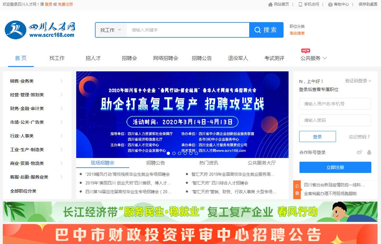 | 網(wǎng)站簡介: 四川人才網(wǎng)(四川省人才網(wǎng))www.scrc168.com成立于2001年,是四川全盛人才官方招聘求職網(wǎng)站,是四川極富影響力的專業(yè)人才網(wǎng)站,年訪問量達(dá)300萬人次,為近3000家用人單位及10萬余人次的流動(dòng)人才提供誠信可靠、專業(yè)高效的招聘求職服務(wù)。人才信息量大、影響覆蓋面廣、招聘效果好、投入少回報(bào)多、人才匹配信息化是我們的服務(wù)特色,竭誠歡迎廣大企事業(yè)單位來我站招聘人才!企業(yè)在我站招聘主要有會(huì)員服務(wù)和網(wǎng)絡(luò)廣告兩種基本形式,其它的特色服務(wù)還有中高級(jí)人才獵頭、人才培訓(xùn)等。 |