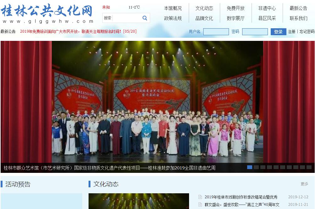 桂林市群眾藝術館成立于1950年3月,原名桂林市人民文化館,1980年改為桂林市群眾藝術館,是由政府設立的,組織輔導和研究群眾文化活動并向社會免費開放的全民所有制公益性文化事業(yè)單位。館內設有:文藝一部、文藝二部、調研部、民族民間文化保護部、美術部、文化服務部、辦公室。截止2016年底,全館共有在編人員37人,本科以上人員27人;其中高級職稱10人,中級職稱22人。多年來,桂林市群眾藝術館以群眾的精神文化需求為導向,服務大局,強化公共文化服務功能,促進文藝精品創(chuàng)作,深化免費開放、文藝培訓和非物質文化遺產的保護傳承工作,以開拓創(chuàng)新的思路,扎實有效的工作作風,形成了“漓江之聲”、“周末大家樂”、桂林國際山水文化旅游節(jié)藝術巡游、“快樂我來秀”、“文化列車”、“千村萬民”農村文藝骨干培訓等特色品牌活動。其中桂林市大型群文活動“漓江之聲”獲2010年全國第十五屆群星獎(項目獎),“周末大家樂”獲中國群眾文化學會和中國文化報社授予“全國特色文化廣場”組織獎,“千村萬民”獲文化部2013年“文化志愿者基層服務年”優(yōu)秀典型。出版了《桂林漁鼓》、《桂林百姓儺》、《桂林龍舟》等課題研究成果。先后獲得文化部表彰的全國文化先進集體、廣西壯族自治區(qū)公共文化服務體系先進集體、桂林市宣傳思想戰(zhàn)線先進集體等榮譽。