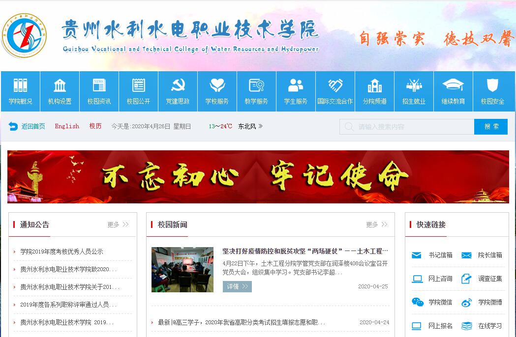 貴州水利水電職業(yè)技術(shù)學(xué)院是經(jīng)貴州省人民政府批準(zhǔn)、國家教育部正式備案成立的全日制公辦普通高職院校,前身為1956年創(chuàng)建的貴州省水利電力學(xué)校,隸屬于貴州省水利廳。新校區(qū)位于貴州(清鎮(zhèn))職教城,占地面積600畝,規(guī)劃建筑面積31.4萬平方米,是一所蘊(yùn)含濃郁水文化特色的節(jié)水節(jié)能、環(huán)保生態(tài)的現(xiàn)代化智慧校園。經(jīng)過六十多年的建設(shè)發(fā)展,學(xué)院現(xiàn)已成為一所以高職為主、中職為輔、成人繼續(xù)教育協(xié)調(diào)發(fā)展、水利水電特色鮮明的高等職業(yè)院校,目前學(xué)院在校學(xué)生1萬余人。建校以來,學(xué)院面向地方和水利電力行業(yè)培育了數(shù)萬名水利電力類的應(yīng)用型合格人才,為貴州水利水電事業(yè)做出了積極貢獻(xiàn),被貴州省水利廳授予“貴州水利人才搖籃”殊榮,學(xué)院先后榮獲“全國學(xué)校德育工作先進(jìn)集體”、“全國水利系統(tǒng)先進(jìn)單位”、“全國水利文明單位”等近百項(xiàng)各級各類表彰及榮譽(yù)稱號,畢業(yè)生就業(yè)率長期穩(wěn)定在98%以上,贏得了良好的辦學(xué)聲譽(yù)。學(xué)院堅(jiān)持社會主義辦學(xué)方向,全面貫徹黨的教育方針,落實(shí)立德樹人根本任務(wù),秉承“自強(qiáng)崇實(shí)、德技雙馨”校訓(xùn),堅(jiān)持“德育為先、能力為重、全面發(fā)展”和“嚴(yán)在當(dāng)嚴(yán)處、愛在細(xì)微中”的育人理念,對學(xué)生在政治思想、生活學(xué)習(xí)、工作就業(yè)等全面關(guān)心基礎(chǔ)上實(shí)行嚴(yán)格的教育管理和規(guī)范要求,強(qiáng)調(diào)“全員、全程、全方位”育人,搭建思政教學(xué)主渠道、黨課教育、道德講堂、校園文化周、志愿者服務(wù)、社團(tuán)活動等各類豐富多彩的育人平臺,始終把“培養(yǎng)什么人”放在學(xué)院各項(xiàng)工作的首位,育人成效顯著,被教育部、人社部共同授予“全國學(xué)校德育工作先進(jìn)集體”。學(xué)院目前開設(shè)有水利工程類、電力工程類、土木工程類、管理工程類四大專業(yè)群,高、中職共計(jì)三十多個專業(yè),始終大力推行工學(xué)結(jié)合、產(chǎn)教融合、校企合作人才培養(yǎng)模式,與貴州水投集團(tuán)公司、貴州建工集團(tuán)、中天城投物管公司、帝豪花園酒店等省內(nèi)外企業(yè)廣泛開展深度校企合作,舉辦訂單班,推行"雙主體"育人,推進(jìn)項(xiàng)目化教學(xué)課程改革,高標(biāo)準(zhǔn)建設(shè)以水工綜合實(shí)訓(xùn)中心——“大禹館”和建筑工程實(shí)訓(xùn)中心——“魯班館”為代表的、能滿足各專業(yè)實(shí)訓(xùn)教學(xué)需要的校內(nèi)實(shí)訓(xùn)基地和實(shí)訓(xùn)室,彰顯“做、學(xué)、教”一體化的職教特色,學(xué)生在全省全國技能大賽中屢獲佳績,先后獲得“全國職業(yè)院校技能大賽國家級一等獎、省級二等獎、省級三等獎”等獎項(xiàng),學(xué)院以水利人才培養(yǎng)的突出成績榮獲水利部、人社部共同授予“全國水利系統(tǒng)先進(jìn)單位”。學(xué)院高度注重教師隊(duì)伍建設(shè),現(xiàn)有教職員工411人,其中專任教師298人,高級職稱教師72人,碩士研究生以上學(xué)歷111人,學(xué)院先后涌現(xiàn)出“全國優(yōu)秀教師”、“全國職業(yè)教育先進(jìn)個人”、“全國職教名師”、“全國水利職教名師”、“全省優(yōu)秀教師”、“全省優(yōu)秀教育工作者”等一大批先進(jìn)典型。近年來,學(xué)院積極響應(yīng)國家“一帶一路”倡議,大力推進(jìn)國際交流與合作,實(shí)現(xiàn)國際化辦學(xué),招收孟加拉國、泰國、柬埔寨等國的留學(xué)生在校學(xué)習(xí),學(xué)院先后與泰國、柬埔寨、馬來西亞、臺灣等多所高校建立校際合作關(guān)系,每年也組織優(yōu)秀學(xué)生到境外大學(xué)進(jìn)行交流學(xué)習(xí);在柬埔寨開辦的“柬埔寨·馬德望省理工學(xué)院中國·貴州水利水電職業(yè)技術(shù)學(xué)院亞龍絲路學(xué)院”正式掛牌,成為貴州省第一個“走出去”辦學(xué)的高職院校;與哥斯達(dá)黎加國家技術(shù)i研究中心簽署《共建中國·貴州水利水電職業(yè)技術(shù)學(xué)院哥斯達(dá)黎加絲路學(xué)院協(xié)議》,再次開啟境外辦學(xué)創(chuàng)新性實(shí)踐。學(xué)院高度重視精準(zhǔn)扶貧工作,專門成立“脫貧攻堅(jiān)辦公室”,充分發(fā)揮職業(yè)教育助力脫貧攻堅(jiān)的優(yōu)勢。精準(zhǔn)資助,采取減免費(fèi)用、設(shè)立獎學(xué)金和助學(xué)金、提供勤工助學(xué)崗位等多種資助方式,幫助家庭經(jīng)濟(jì)困難學(xué)生完成學(xué)業(yè);送教下鄉(xiāng),為貧困村民提供技能培訓(xùn),提升就業(yè)能力和薪酬水平;“校農(nóng)結(jié)合”,拓展與貧困農(nóng)村的幫扶合作,助推貧困地區(qū)產(chǎn)業(yè)發(fā)展;主動作為,攜手政府和企業(yè)共同舉辦“全免費(fèi)訂單職業(yè)教育精準(zhǔn)脫貧班”,創(chuàng)造為廣大學(xué)子“拎包就讀”的政策條件,搭建“招生——培養(yǎng)——就業(yè)”直通車。學(xué)院與河海大學(xué)、華北水利水電大學(xué)、南昌工程學(xué)院聯(lián)辦成人大專、本科教育,同時是全國電工進(jìn)網(wǎng)作業(yè)許可證培訓(xùn)考
