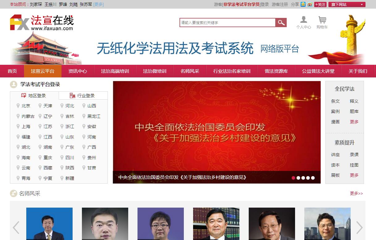 法宣在線(www.faxuan.net),國家工作人員在線普法學(xué)習(xí)考試平臺,無紙化學(xué)法用法及考試系統(tǒng)。提供法治培訓(xùn)講座、普法視頻、法治公開課、七五普法等在線法治宣傳教育資料。國家工作人員在線學(xué)法考試平臺暨《無紙化學(xué)法用法及考試系統(tǒng)》網(wǎng)絡(luò)版平臺 ,是在全國普法辦《無紙化學(xué)法用法及考試系統(tǒng)》十多省份數(shù)百萬人在線使用的基礎(chǔ)上取長補短,并結(jié)合4G 移動網(wǎng)絡(luò)的普及運用,采用云計算 + 云負(fù)載 + 移動端技術(shù)開發(fā)的,是目前國內(nèi)唯一一套能夠?qū)崿F(xiàn)千萬級學(xué)員在線、百萬級考生同時考試的無紙化學(xué)法用法及考試系統(tǒng)的升級換代產(chǎn)品。《無紙化學(xué)法用法及考試系統(tǒng)》網(wǎng)絡(luò)版平臺,除嚴(yán)格按照國家普法規(guī)劃要求設(shè)置了幾十門學(xué)法“公共課程、行業(yè)課程”外,還特別添加了“法治高端培訓(xùn)、法治微講座、行政執(zhí)法資格證”等諸多精品課程,是領(lǐng)導(dǎo)干部、公務(wù)員、企業(yè)管理人員必備的學(xué)習(xí)資源庫。目前已有山西、內(nèi)蒙古、吉林、黑龍江、河南、湖北、湖南、福建、江蘇、山東、廣東、廣西、海南、四川、貴州、云南、陜西、青海、寧夏、新疆等20?。ㄖ陛犑?、自治區(qū))的組織、宣傳、司法、人社、國資等部門聯(lián)合發(fā)文實施無紙化學(xué)法用法及普法考試工作,注冊用戶770多萬人。