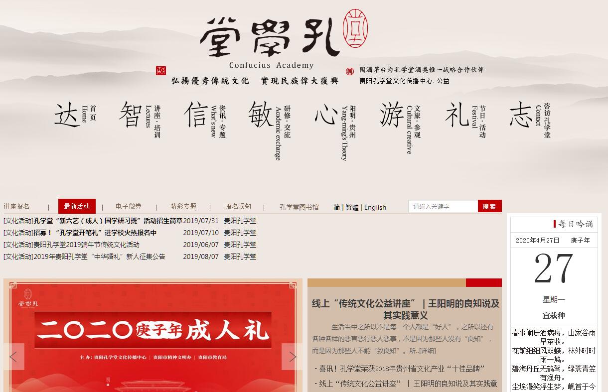 孔學堂網由多彩貴州網有限責任公司主辦??讓W堂坐落在貴州省貴陽市南郊,東毗大成山,西臨花溪河,俯瞰國家級濕地公園花溪十里河灘,總占地1320余畝,建筑面積近15萬平方米,按功能劃分為“公眾教化區(qū)”,“中華文化國際研修園”和“文化創(chuàng)意產業(yè)園”,由民營企業(yè)捐資15億元人民幣建設。孔學堂是貴州省高端的文化學術交流平臺和傳習研修基地。孔學堂堅持“創(chuàng)造性轉化、創(chuàng)新性發(fā)展”方針,以傳承弘揚中華優(yōu)秀傳統(tǒng)文化,培育踐行社會主義核心價值觀為宗旨。自2013年1月1日正式對外開放以來,邀請海內外名家舉辦傳統(tǒng)文化公益講座,每年達100余場;開設“領導干部歷史文化講座”;舉辦“開筆禮”、“成人禮”、“中華婚禮”、“敬老禮”、“9.28祭孔大典”等典禮活動以及春節(jié)、清明、端午、中秋、重陽、“二十四節(jié)氣”等民俗文化活動;開展“溪山踏歌行”系列演出、“溪山翰跡”書畫創(chuàng)作展出等文化藝術交流活動;為青少年開展了琴、棋、書、畫、詩、禮等“六藝培訓”;與國內多所著名高校及海內外學術機構建立合作交流機制,廣泛開展陽明洞會講、孔學堂四季論辯大會等重大學術交流、研討活動??讓W堂將努力建成為貴州對外文化交流的重要平臺、構筑貴州“精神高地”的重要支撐,為實現中華民族偉大復興的中國夢而窮盡其力!