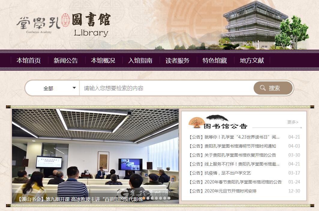 貴陽孔學(xué)堂圖書館坐落于花溪河畔的孔學(xué)堂中華文化國(guó)際研修園,東毗大成山,西鄰花溪河,俯瞰十里河灘,建筑面積2581平方米,是一座集數(shù)字化、檢索、展示、閱覽、管理為一體,兼具人文教育、學(xué)術(shù)研究、文化傳承、形象展示、社會(huì)服務(wù)等功能的專業(yè)圖書館。也是國(guó)內(nèi)第一個(gè)全方位,多層次整合國(guó)學(xué)資源、陽明學(xué)資源的國(guó)學(xué)現(xiàn)代化圖書館。本館館藏資源是紙電文獻(xiàn)并存。紙質(zhì)圖書主要包括研究性文獻(xiàn)、閱讀性文獻(xiàn)及珍藏性文獻(xiàn)三大類別。研究性文獻(xiàn)主要包括古典文獻(xiàn)(按經(jīng)、史、子、集分類入藏)和研究專著(包括港臺(tái)文獻(xiàn)與外文文獻(xiàn)),主要服務(wù)對(duì)象是相關(guān)領(lǐng)域的專家學(xué)者;閱讀性文獻(xiàn)主要包括:一、民國(guó)及以前大量幼學(xué)訓(xùn)蒙類教材和書籍(含港臺(tái)類);二、儒學(xué)、歷史、文學(xué)、藝術(shù)等領(lǐng)域的輔助讀物;三、針對(duì)青少年的“六藝”類圖書;珍藏性文獻(xiàn)主要是地方文獻(xiàn)(包括一些珍本、善本)及其相關(guān)外文文獻(xiàn)。整個(gè)圖書樓的功能布局為開放式格局。設(shè)有綜合閱覽區(qū);電子閱覽區(qū);自主研修區(qū);特藏文獻(xiàn)區(qū)。館內(nèi)藏書實(shí)行開架借閱,每一層樓都設(shè)有數(shù)字化讀者體驗(yàn)區(qū),讀者可通過“互動(dòng)觸摸”、“電子翻書”、“電子查詢”、“云屏數(shù)字借閱機(jī)”、“kindle閱讀器”等數(shù)字化多媒體設(shè)備,了解館藏資源。數(shù)字化多媒體技術(shù)的運(yùn)用,實(shí)現(xiàn)了網(wǎng)絡(luò)資源的共享和館內(nèi)咨詢服務(wù)的統(tǒng)一,為讀者提供了方便快捷的檢索服務(wù)。本館基于互聯(lián)網(wǎng)+數(shù)字閱讀的云端平臺(tái),突破了實(shí)體圖書館的諸多限制。讀者通過“云+端”模式,可實(shí)現(xiàn)“24 小時(shí)無障礙無邊界立體式閱讀”,真正實(shí)現(xiàn)了任何人在任何時(shí)間任何地點(diǎn)訪問數(shù)字圖書館內(nèi)任何內(nèi)容的5A(Anyone、Anytime、Anywhere、Anyway、Any content)目標(biāo)。讀者除直接訪問孔學(xué)堂數(shù)字圖書館專屬網(wǎng)站進(jìn)行在線數(shù)字閱讀外,也可以通過手機(jī)客戶端下載閱讀,還可以通過館內(nèi)云屏數(shù)字借閱機(jī)掃描二維碼之后借閱電子書刊。現(xiàn)有10萬種電子圖書、300多種電子報(bào)刊、3萬集音頻資源、20G國(guó)學(xué)講堂、500,000分鐘視頻資源,18萬集聽書資源。內(nèi)容涵蓋諸子百家、宗教哲學(xué)、古典文學(xué)、歷史、傳統(tǒng)禮儀、傳統(tǒng)藝術(shù)等。在數(shù)字資源建設(shè)方面,本館依托大數(shù)據(jù)技術(shù)與國(guó)家骨干信息網(wǎng)絡(luò)、教育專用網(wǎng)絡(luò)等世界一流圖書館互聯(lián),匯聚多渠道、多類別的國(guó)學(xué)資源,并提供多途徑的檢索方式,實(shí)現(xiàn)題名、主題、著者、類型、年代等多維度查詢檢索,且具備分面聚類瀏覽功能。目前,所存儲(chǔ)的國(guó)學(xué)數(shù)字資源已達(dá)11個(gè)TB,其中孔學(xué)堂本地中心機(jī)房存儲(chǔ)量1TB,通過鏡像、云端方式存儲(chǔ)量10TB,已購買了9個(gè)商業(yè)數(shù)據(jù)庫,自建了國(guó)學(xué)專題數(shù)據(jù)庫,并網(wǎng)絡(luò)大量相關(guān)免費(fèi)資源鏈接的集成。同時(shí)以云平臺(tái)為技術(shù)支撐,將內(nèi)容豐富的國(guó)學(xué)資源圖文并茂地呈現(xiàn)給讀者,形成整合各類國(guó)學(xué)數(shù)字資源的專題資源庫,和集海量檢索、實(shí)時(shí)在線咨詢、知識(shí)挖掘與分析、受眾分析等多功能為一體的國(guó)學(xué)智慧云系統(tǒng)。在讀者服務(wù)方面,我館基于 “書香孔學(xué)堂”互聯(lián)網(wǎng)+數(shù)字閱讀平臺(tái)的云端,為每位讀者打造專屬的“個(gè)人數(shù)字圖書館”。每位讀者都可通過自己的“虛擬書房”從“書香孔學(xué)堂”平臺(tái)提供的海量資源中,選取自己感興趣的數(shù)字圖書或其他資源放入自己的“個(gè)人數(shù)字圖書館”中,形成自己在網(wǎng)上獨(dú)有的個(gè)性化圖書館。由于互聯(lián)網(wǎng)不受地域限制的特點(diǎn),使得多位國(guó)學(xué)愛好者之間實(shí)現(xiàn)實(shí)時(shí)互動(dòng),可將閱讀、寫作的經(jīng)驗(yàn)和體會(huì)進(jìn)行展示和交流。這就使“書香孔學(xué)堂”閱讀平臺(tái)形成一個(gè)巨大的網(wǎng)絡(luò)閱讀社區(qū),不同讀者們可以以書會(huì)友,隨時(shí)分享閱讀的收獲和快樂,不僅摒棄了以往閱讀紙書時(shí)難以分享的弊端,同時(shí)還通過互動(dòng)社交化的數(shù)字閱讀促進(jìn)讀者之間、社區(qū)之間、家庭之間的互動(dòng)和交流,從而使國(guó)學(xué)閱讀成為一種群體行為和社會(huì)現(xiàn)象。秉承 “古為今用,傳承教化”的宗旨,為了進(jìn)一步弘揚(yáng)中華優(yōu)秀傳統(tǒng)文化、展示本土文化,倡導(dǎo)“天人合一、知行合一”的貴州人文精神,我館正著力打造“國(guó)學(xué)(陽明‘心學(xué)’)”版塊和“多彩貴州”特色民族文學(xué)版塊,從而使孔學(xué)堂圖書館成為更具鮮明地方特色的國(guó)學(xué)圖書館。