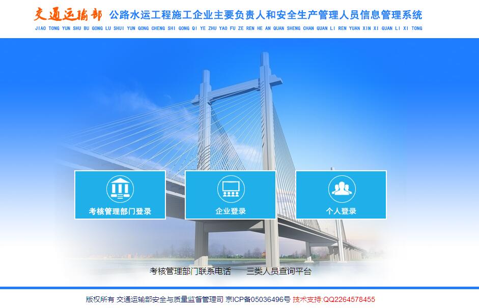 | 網(wǎng)站名稱(chēng): | 交通運(yùn)輸部公路水運(yùn)工程企業(yè)負(fù)責(zé)人和安全生產(chǎn)管理人員信息管理系統(tǒng) | ||