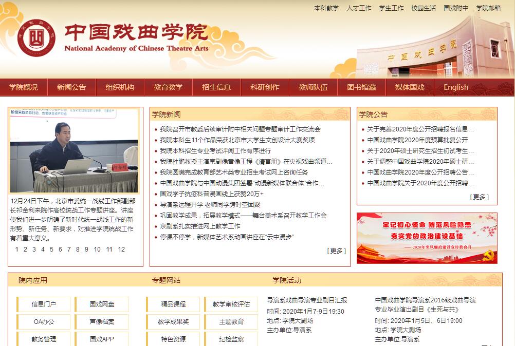 中國戲曲學(xué)院是中國唯一一所獨立建制的培養(yǎng)戲曲藝術(shù)高級專門人才的院校,是中國戲曲教育的最高學(xué)府,在國內(nèi)戲曲教育領(lǐng)域中,專業(yè)最完備、培養(yǎng)體系最健全、優(yōu)質(zhì)師資最集中、輸送高端專業(yè)人才最多、業(yè)內(nèi)影響最大,在全國戲曲教育領(lǐng)域中起到引領(lǐng)示范作用,是全國“戲曲特色鮮明、國內(nèi)水準(zhǔn)一流、國際影響廣泛”的高水平特色大學(xué),被譽為“中國高端戲曲人才培養(yǎng)的搖籃”。學(xué)院成立于1950年1月,是新中國由國家舉辦的第一所戲曲教育機(jī)構(gòu),首任校長是中華人民共和國國歌詞作者田漢先生。校訓(xùn)是“德藝雙馨,繼往開來”。學(xué)院原隸屬文化部,最初稱文化部戲曲改進(jìn)局戲曲實驗學(xué)校,1955年1月正式定名為中國戲曲學(xué)校。1978年10月經(jīng)國務(wù)院批準(zhǔn)改制為中國戲曲學(xué)院,并招收第一屆本科生。2000年學(xué)院劃轉(zhuǎn)北京市,2014年,文化和旅游部和北京市人民政府共建中國戲曲學(xué)院。學(xué)院現(xiàn)有“戲劇與影視學(xué)”、“音樂與舞蹈學(xué)”、“藝術(shù)學(xué)理論”3個一級學(xué)科碩士點及14個專業(yè)、28個本科專業(yè)方向,戲劇戲曲學(xué)為北京市重點學(xué)科。京劇表演專業(yè)是學(xué)院的傳統(tǒng)優(yōu)勢專業(yè)、國家和北京市兩級特色專業(yè)、北京市屬高校首批一流專業(yè)。學(xué)院目前設(shè)有京劇系、表演系、導(dǎo)演系、音樂系、戲曲文學(xué)系、舞臺美術(shù)系、新媒體藝術(shù)系、國際文化交流系、思想政治理論課教學(xué)部、體育部、繼續(xù)教育部等教學(xué)單位,下設(shè)附中,形成了包括戲曲中等教育、本科教育、研究生教育、繼續(xù)教育、留學(xué)生教育等在內(nèi)的層次基本齊備、具有鮮明“國戲”特色的戲曲人才培養(yǎng)格局。建校以來,學(xué)院汲取以“富連成”等為代表的傳統(tǒng)科班人才培養(yǎng)傳統(tǒng),順應(yīng)現(xiàn)代藝術(shù)教育的趨勢,始終以繼承弘揚民族傳統(tǒng)優(yōu)秀文化為己任,形成了“教學(xué)、實踐、科研、創(chuàng)作”四位一體的人才培養(yǎng)模式,培養(yǎng)了大批戲曲藝術(shù)精英,涌現(xiàn)出劉秀榮、謝銳青、孫岳、朱秉謙、錢浩梁、楊少春、張春孝、李鳴巖、袁國林、侯正仁、楊秋玲、俞大陸、王晶華、王夢云、吳鈺璋、馬名駿、劉長瑜、馮志孝、李長春、寇春華、鄭巖、李光、李玉聲、葉少蘭、李欣、高牧坤、沈健瑾、李維康、耿其昌、鄭子茹、陳淑芳、楊鳳一、劉子蔚、李宏圖、于魁智、杜鎮(zhèn)杰、李軍、侯丹梅、孟廣祿、王潤菁、王蓉蓉、周龍、董圓圓、趙永偉、袁慧琴、王平、江其虎、楊少鵬、譚正巖、王璐、張建峰、杜喆、竇曉璇、詹磊等一大批優(yōu)秀表演人才。學(xué)院先后承辦了六屆“中國京劇優(yōu)秀青年演員研究生班”,張火丁、李勝素、遲小秋、張建國、張克、奚中路、王立軍、楊赤、史依弘、沈鐵梅、曾昭娟等229名畢業(yè)生已經(jīng)成為當(dāng)今全國重點戲曲院團(tuán)的領(lǐng)軍人物。建校之初,就匯集了一批新文化工作者和傳統(tǒng)科班著名教師,聘請了王瑤卿、蕭長華、王鳳卿、尚和玉、譚小培、張德俊、金仲仁、鮑吉祥、馬德成等教授和“四大名旦”梅蘭芳、尚小云、程硯秋、荀慧生來校授課,奠定了優(yōu)良的育人傳統(tǒng),為中國戲曲學(xué)院教育發(fā)展打下了堅實的基礎(chǔ)。目前,學(xué)院延聘全國戲劇戲曲界各專業(yè)、各劇種百余位戲曲表演藝術(shù)家、理論家為學(xué)院榮譽教授、客座教授,已經(jīng)形成了一支師德高尚、業(yè)務(wù)精湛、結(jié)構(gòu)合理、充滿活力、新老結(jié)合、院內(nèi)外結(jié)合、在職與客座結(jié)合的師資隊伍,被譽為全國戲曲人才培養(yǎng)的“國家隊”。學(xué)院學(xué)術(shù)研究體系日趨完善。學(xué)院為北京戲曲文化傳承與發(fā)展研究基地、首批中國文藝評論基地,北京高校中國特色社會主義理論研究協(xié)同創(chuàng)新中心協(xié)同單位。設(shè)有中國戲曲音樂學(xué)會、中國戲曲導(dǎo)演學(xué)會兩個國家一級學(xué)會,還擁有包括戲曲研究所、京劇研究所、梅蘭芳藝術(shù)研究中心、張火丁程派藝術(shù)傳承中心等學(xué)術(shù)研究平臺。召開京劇學(xué)國際研討會,推出了一大批高水準(zhǔn)的研究成果,在業(yè)界產(chǎn)生了廣泛學(xué)術(shù)影響,為建構(gòu)和完善中國戲曲理論體系奠定了堅實的基礎(chǔ)。以藝術(shù)實踐和創(chuàng)作推動教學(xué)建設(shè),是學(xué)院辦學(xué)的優(yōu)良傳統(tǒng),也是學(xué)院人才培養(yǎng)的特色。學(xué)院積極參與重大藝術(shù)創(chuàng)作,主動參與各級優(yōu)秀戲曲劇本創(chuàng)作扶持和優(yōu)秀經(jīng)典戲曲劇目影視創(chuàng)作,創(chuàng)排了《白蛇傳》《穆桂英大戰(zhàn)洪州》《賣水》《對花槍》《岳云》《杜十娘》《悲慘世界》《哪吒》《梅蘭霓裳》《梁?!返纫慌哂忻褡逍?、時代性以及學(xué)院風(fēng)格的優(yōu)秀作品。作為行業(yè)教育的領(lǐng)軍者,學(xué)院主動履行大學(xué)責(zé)任,承擔(dān)國家使命。學(xué)院承辦由中宣部、文化和旅游部主辦的體現(xiàn)國家文化價值導(dǎo)向的“新年