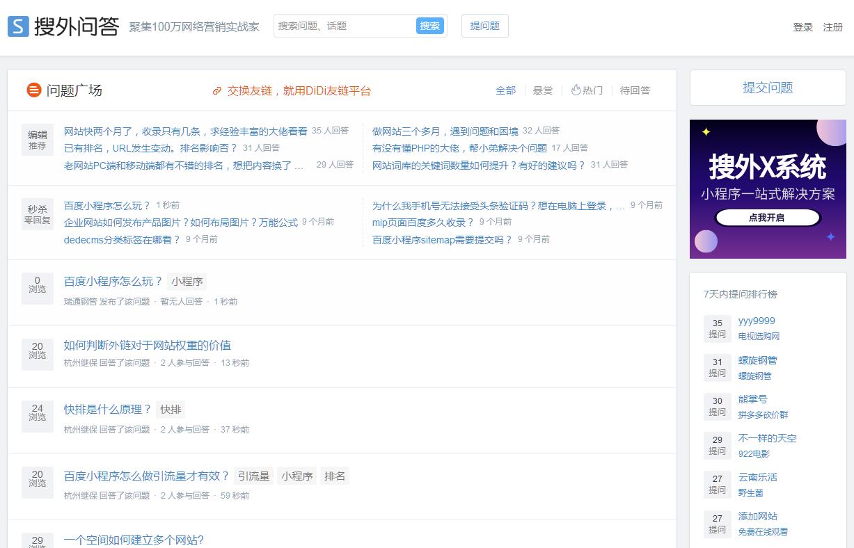 | 網(wǎng)站簡介: 搜外問答,專注SEO、SEM、百度智能小程序、頭條搜索、微信搜索懸賞問答社區(qū)。 |