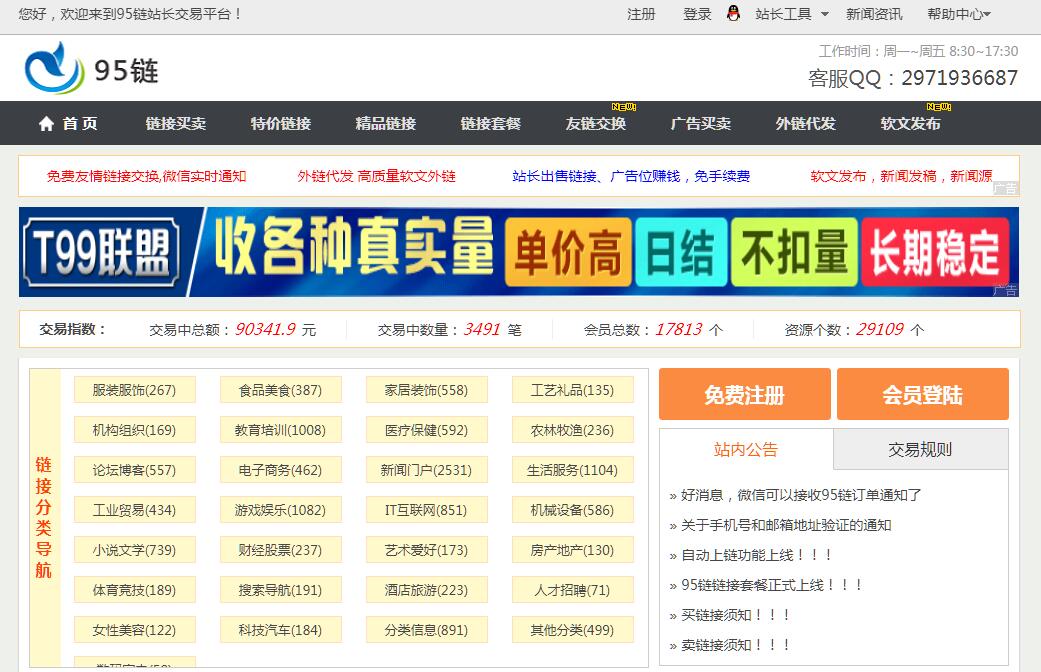 | 網(wǎng)站簡(jiǎn)介: 95鏈平臺(tái)是國(guó)內(nèi)新興的站長(zhǎng)交易平臺(tái)。95鏈為站長(zhǎng)提供友情鏈接買賣、網(wǎng)站廣告買賣、軟文發(fā)布交易、友情鏈接交換、外鏈代發(fā)等專業(yè)服務(wù)。95鏈一直在不斷的努力,將持續(xù)不斷地為廣大站長(zhǎng)提供優(yōu)質(zhì)、高效的服務(wù)。 |