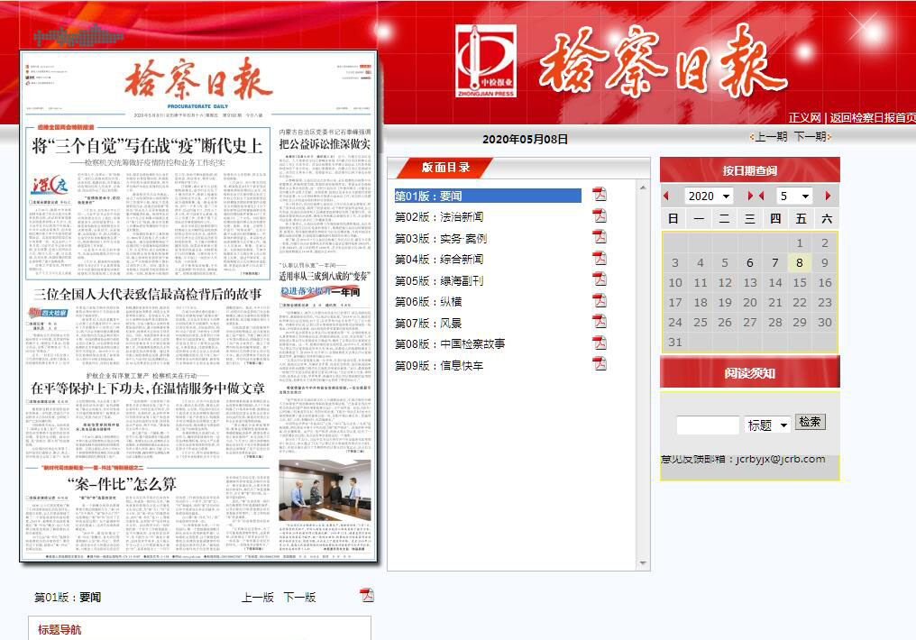 檢察日?qǐng)?bào)電子版,檢察日?qǐng)?bào)多媒體數(shù)字報(bào)?!稒z察日?qǐng)?bào)》由中華人民共和國(guó)最高人民檢察院主辦。它立足檢察,宣傳法治,及時(shí)報(bào)道社會(huì)主義法制建設(shè)的最新動(dòng)態(tài)、熱點(diǎn)和難點(diǎn)問題,高揚(yáng)反腐倡廉的旗幟。它向讀者全方位地展示法制社會(huì)尤其是檢察機(jī)關(guān)保護(hù)人民、懲罰犯罪的光輝業(yè)績(jī),使讀者知法、懂法、守法,了解如何依法保護(hù)國(guó)家、集體利益和個(gè)人的合法權(quán)益?!稒z察日?qǐng)?bào)》的前身《中國(guó)檢察報(bào)》創(chuàng)刊于1991年7月4日,1996年1月1日更名為《檢察日?qǐng)?bào)》。2011年7月8日,《檢察日?qǐng)?bào)》創(chuàng)刊20周年座談會(huì)在最高人民檢察院舉行。20年來,該報(bào)逐漸從周刊發(fā)展為日?qǐng)?bào),從單一的報(bào)紙發(fā)展為以報(bào)紙、雜志為主體,以影視、網(wǎng)絡(luò)為兩翼的法治專業(yè)傳媒。該報(bào)堅(jiān)持做到“檢察新聞社會(huì)化、社會(huì)新聞法治化、法治新聞專業(yè)化”,在服務(wù)檢察工作和民主法治建設(shè)中發(fā)揮著積極的作用?!稒z察日?qǐng)?bào)》每周推出《聲音周刊》、《廉政周刊》、《法治評(píng)論》周刊、《明鏡周刊》、《綠海周刊》,以警醒世人的大案要案、精辟縝密的經(jīng)法透視和耐人深思的社會(huì)問題追蹤,以及環(huán)球司法最新動(dòng)態(tài),帶給讀者新感覺、新視角、新思維。2018年3月,獲“2017年百強(qiáng)報(bào)紙”榮譽(yù)。