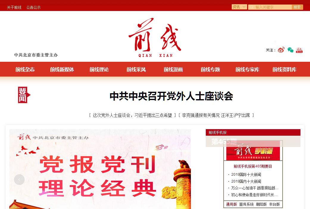 | 網(wǎng)站簡介: 前線網(wǎng)是中共北京市委機(jī)關(guān)刊《前線》雜志主辦的黨刊網(wǎng)站。前線網(wǎng)是特色鮮明的思想政治理論學(xué)習(xí)網(wǎng)站,宣傳黨的路線、方針、政策,解讀市委、市政府重要政策,是思想理論探討爭鳴的平臺(tái),干部群眾理論學(xué)習(xí)的平臺(tái),黨群、干群交流互動(dòng)的平臺(tái),重要黨報(bào)黨刊交流的平臺(tái)。 |